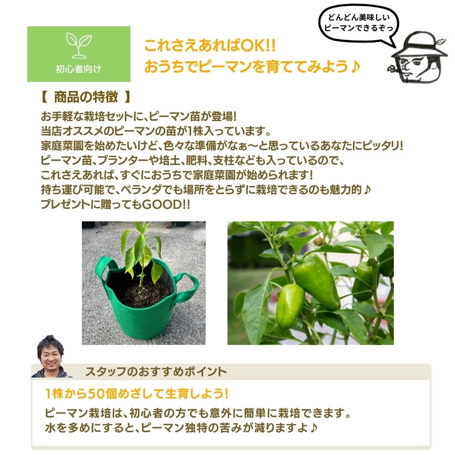 商品名ピーマン栽培セット 内容・ピーマン苗1株・特製培土20L・フェルトプランター・鉢底石・支柱・クリップ・肥料・おまけ苗・育て方マニュアル 特徴てしまの苗屋オススメのピーマン栽培セット。培土やプランター、支柱肥料など栽培に必要なものは全部入っているので、届いてからすぐに栽培できます。育て方マニュアル付きで、これさえあれば初めての方でも安心して栽培できます!しかも送料無料!
