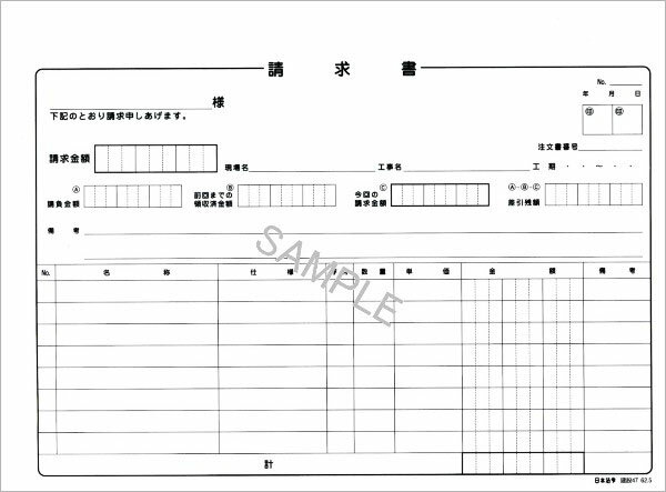 建設業務の様式なら日本法令! 2枚複写式請求書・25組入り。 B5サイズヨコ。 こちらの商品は店頭同時販売になります。ご注文のタイミングや数量によっては店頭販売による品切れにより、メーカー取り寄せとなる場合がございます。3営業日以内の発送を心がけますが、メーカー品切れによる納期延期の場合は速やかにメールにてお知らせいたします。ご了承ください。建設47 (建設工事)請求書 2枚複写・B5サイズ