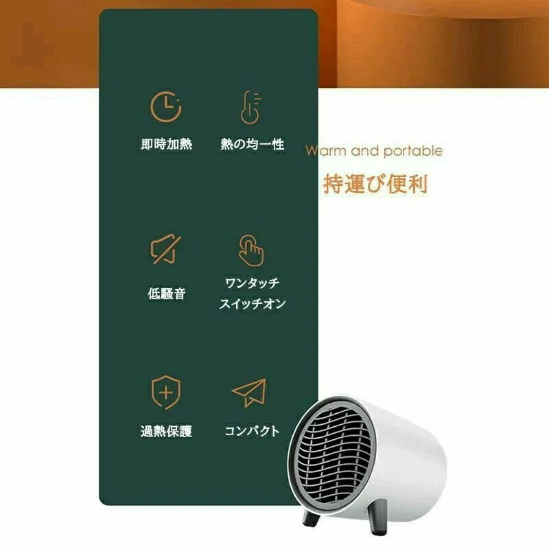 【仕様】 材質:ABS オプションの色:ホワイト パワー:600W 付属:電源プラグ 定格電圧:110V / 50Hz サイズ:14*14.5*13cm(約) 【3秒速熱、すぐに使える】自動的に一定の温度を維持し、酸素を消耗することなく、加熱スピードが早くて効率的です。スイッチを入れてたった3秒で暖かさを感じられます。特別な設定は不要です。 【表面ABS難燃素材】ファンヒーターの表面は高い難燃性と優れた耐熱性を持つABS素材を採用しており、火災を引き起こす心配がありません。 【過熱保護機能で安心】 電気ヒーター本体の温度(120℃)が上がり過ぎた時は自動的に停止します。消し忘れ消火機能付きです。難燃性があるABS素材で作られているので、見た目はプラスチックのようですが高温でも溶けません。 【注意】 (1)当商品は防水仕様ではありません、水で濡らせないでください。 (2)使用の時に、商品の上を物で覆わないでください。
