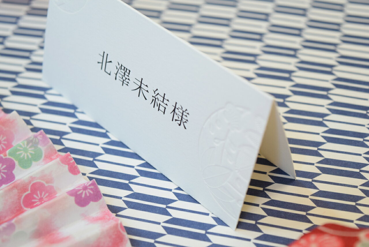 2022年11月1日より小部数1〜9部(10セット未満)のご注文、 お急ぎ納品(2週間以内の納品)にはオプション料金が別途発生いたします。 該当するご注文に関しましては、各オプションも併せてご注文くださいませ。 ご理解ご協力の程、何卒よろしくお願いいたします。 不老長寿の意味もあり 慶事に用いる代表的な植物「松竹梅」 伝統的な和のテイストを取り入れながら モダンなデザインに仕上げました 縁起が良く繊細で深みあるデザインは お二人の晴れの舞台に相ふさわしい商品です 【商品詳細】 結婚式 席札 W102mm×H49mm(立てた状態) 特殊漢字も対応可能です。 パソコン、スマートフォンで変換されない漢字は手書きしたものを写真でお送りください。 席札と同じデザインで、席次表・メニュー・ゲストブックもございます! ※小部数1〜9部(10セット未満)でのご注文の場合、校正料金が発生いたします。 商品と併せてご注文くださいませ。 校正料金 ※お急ぎ納品(2週間以内の納品)をご希望の場合、特急料金が発生いたします。 商品と併せてご注文くださいませ。 特急料金 【ご注文の流れ】 まずはカートより必要枚数分ご注文ください。 ご注文後、席札作成フォームをメールにてお送りいたします。 必要箇所をご入力いただき、ご返信いただけますと幸いです。 基本的にはデータでお名前をお送りいただきましたら確認事項が無い限り、 そのまま印刷の手配をさせていただきます。 手書きの原稿をお送りいただいた際には、メールにて、 席札原稿をお送りいたしますので文字に間違いがないかをご確認ください。 パソコンをお持ちでない方もご安心ください! 【ご要望がございましたらご相談ください!】 ご不明点などございましたら、お気軽にお問い合わせください。 ベテランスタッフが対応いたします。