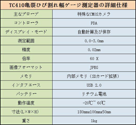 TC410亀裂ひび割れ幅ゲージ測定器 TIME社のTC410亀裂ひび割れ幅ゲージ測定器は 広く橋、トンネル、構造やコンクリート構造物のひび割れ幅の非破壊検査に使用されます。 検出時に、システムは自動的に亀裂の画像を取得し、リアルタイム画像やクラックの幅のデータが表示されます。 画像データは自動的に保存することができます。 特徴 ■データ·アクイジション·プローブを用いたPDA設計 ■自動画像認識と知的な幅の計算手法 ■調整なしでクイック測定 ■PDAの大画面 ■画像ファイルはJPEG形式で保存することができます ■ソフトウェア利用、画像やデータを保存し、分析できるようにすることができます ■メーカーの品質保証書 標準付属品 ■測定器本体 ■トランスジューサ ■PDAメインユニット ■ソフトウェア ■信号ケーブル ■USBケーブル ■ユニバーサルカップリング ■エクステンションロッド ■SDカードリーダ ■充電器 ■取扱説明書 ■メーカー品質保証書 1年無償保証メーカーへの修理依頼対応可初期不良の即交換対応万が一の故障でもご安心ください。全国送料無料TIME■【正規代理店】[TC410]亀裂ひび割れ幅ゲージ測定器TC410