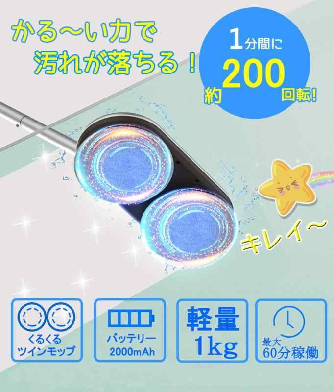 電動 回転モップクリーナ 軽量 電動モップ 水拭き コードレス 床拭き モップパッド4枚付き フローリング掃除 高速回転 充電式 自立式 掃除グッズコードレス回転モップクリーナー回転モップは回転速度が重要回転モップはより速く、より強力な洗浄能力を備えており、回転速度は最大200回転に達することができて、力を入れず、汚れやほこりをしっかりと拭き取ります。掃除効率を向上して、楽々になれますので、 家事に苦労した人を解放できて、この電動モップをお勧めております。軽量化の電動モップこの電動モップは人間工学に基づいて設計されているため、床の隅々まで簡単かつ便利に掃除できます。軽量化の本体はわずか1KGなので、軽くて簡単立ったまま床掃除が出来る力を入れなくても、床を滑らせるようにスムーズにお掃除ができます。老人なども楽に使えます。壁も床も、家中お掃除ベッド下などの狭い場所や、窓などの壁、天井などの高い場所も隅々までお掃除できます。また、充電式のコードレスタイプなので、コードの抜き差しも不要フローリングはもちろん、毛足の短いカーペットや畳、階段、ソファーの下、網戸、お風呂の天井などをお掃除できます。洗えるモップパッド4枚付き、とっても経済的特殊繊維のモップパッドが4枚付き、回転しながら細かい汚れをしっかり絡めとります吸水性、耐摩耗性、耐久性に非常に優れ、床面を傷つけずお掃除出来ます。洗って使えるモップパッドで、手洗いでも洗濯機でもお手入れできます。自立式で収納場所も選ばない自立するから収納しやすく、お掃除中もサッと置いておける。または、長さ調節可能なパイプなので、使用する方の身長に合わせて使えます。 場所に合わせて、スティックでもハンディでもお使いいただけます。