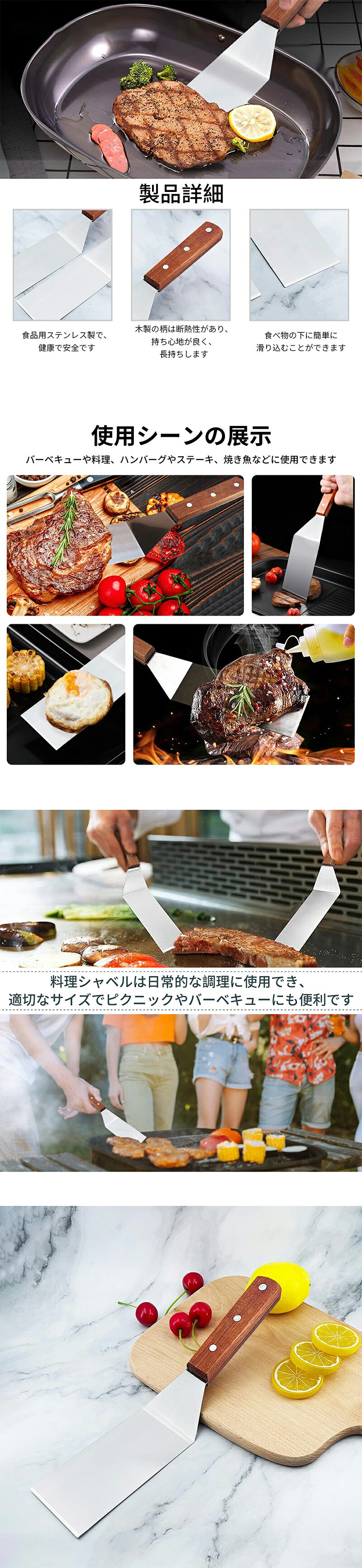 フライ返し ターナー 料理シャベル キッチンツール 返しやすい 餃子 ハンバーグ ステーキ バーベキュー アウトドア キャンプ ステンレス 木柄