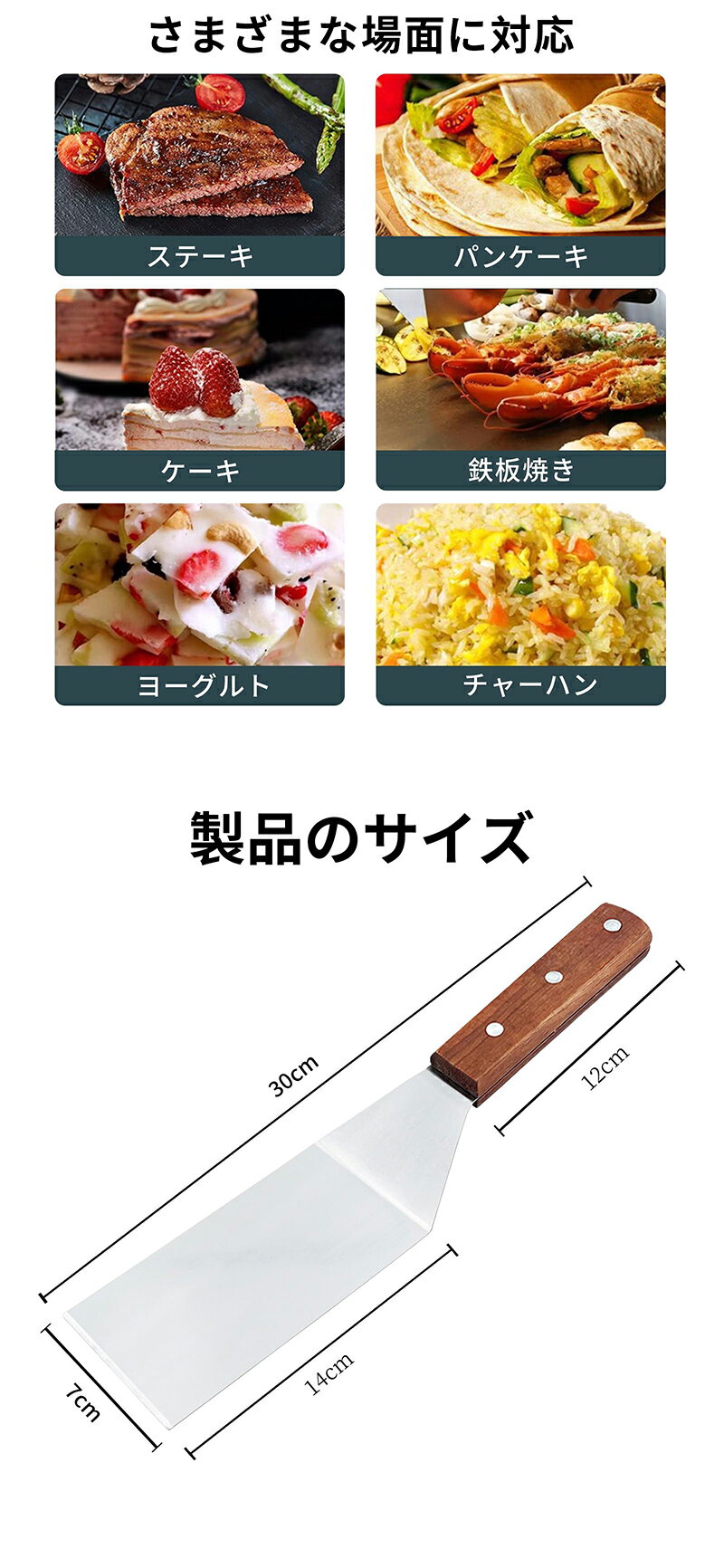 商品詳細 詳細 【フライ返し】このフライ返しの長くて幅の広いブレードは、より簡単にバーベキュー、反転、フライを行うことができます。人間的なデザインはあなたの料理をより便利にします。柔らかい食べ物をカットしたり、食べ物の残りかすを取り除いたりすることもできます。 【使いやすい】このターナーは食べ物の下に簡単に滑り込むことができ、食べ物を損なうことはありません。洗浄が簡単、キッチンやアウトドアで使用できます。グリルで簡単に食べ物をカットしたり、魚やステーキなどをひっくり返したりすることができます。 【用途は幅広い】料理シャベルは日常的な調理に使用でき、適切なサイズでピクニックやバーベキューにも便利です。バーベキューや料理、ハンバーグやステーキ、焼き魚などに使用できます。それはあなたのためにいろいろなおいしい料理を作ることができます。 【良質材料】この専門キッチンツールは420ステンレス製で、健康で安全です。木製のハンドルは断熱性があり、握り心地が良く、長持ちします。キッチンやバーベキュー愛好家の必須ツールです。 【製品サイズ】フライ返しサイズは:30 x 7cm、重量約140g。フライ返しには一定の角度があり、使い心地がよく、コントロールが上手です。