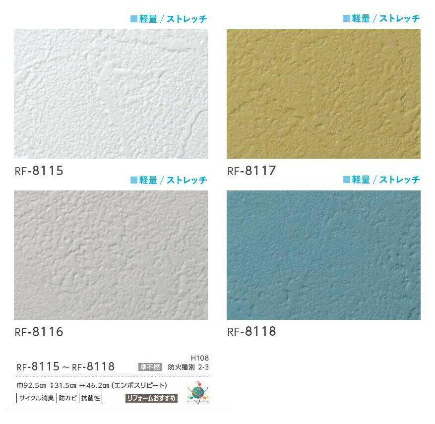 商品情報商品品番rf8115 rf8116 rf8117 rf8118巾92.5cm準不燃 サイクル消臭、防カビ、塩化ビニル樹脂系壁紙JIS A 6921規格適合品、SV規格適合品、F☆☆☆☆シックハウス対策仕様。防火種別2-3 H108DIY 簡単リフォーム※当店の商品はすべてメーカー在庫です。メーカー在庫切れの場合は納期が遅れる場合がございます。納期に余裕をもってご注文ください。商品特徴空気を洗う壁紙? は、表面層に消臭剤 トリプルフレッシュ? をコーティング加工した消臭壁紙です。空気中の臭い成分が壁紙表面層の トリプルフレッシュ? 消臭剤に触れることで吸着し、化学反応によって、水・二酸化炭素に分解・放出されます。2005年の発売以来、全国のホテル・宿泊施設、医療施設、介護・福祉施設、教育施設、商業施設、一般住宅など数多くご採用いただいております。関連商品ルノン 空気を洗う壁紙? のりなし 準不燃 サイクル消臭 防カビ ...ルノン 空気を洗う壁紙? のりなし 準不燃 サイクル消臭 防カビ ...ルノン 空気を洗う壁紙? のりなし 準不燃 サイクル消臭 防カビ ...430円430円430円ルノン 空気を洗う壁紙? のりなし 準不燃 サイクル消臭 防カビ リ...ルノン 空気を洗う壁紙? のりなし 準不燃 サイクル消臭 防カビ リ...ルノン 空気を洗う壁紙? のりなし 準不燃 サイクル消臭 防カビ ...430円430円430円ルノン 空気を洗う壁紙? のりなし 準不燃 サイクル消臭 防カビ ...ルノン 空気を洗う壁紙 のりなし 不燃 サイクル消臭 防カビ 透湿性...ルノン 空気を洗う壁紙? のりなし 準不燃 サイクル消臭 防カビ ...430円430円430円ルノン 空気を洗う壁紙? のりなし 準不燃 サイクル消臭 防カビ ...ルノン 空気を洗う壁紙? のりなし 準不燃 サイクル消臭 防カビ ...ルノン 空気を洗う壁紙? のりなし 準不燃 サイクル消臭 防カビ ...430円430円430円ルノン 空気を洗う壁紙? のりなし 準不燃 サイクル消臭 防カビ 抗菌性 軽量 ストレッチ リフォームおすすめ アクセントカラー RF-8115〜RF-8118 国産壁紙、簡単DIY、壁紙張り替え、長期保管可能 2