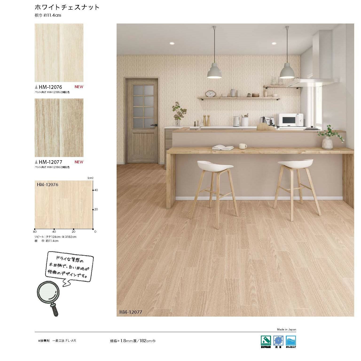 商品情報商品品番hm12076 hm12077HM-12076 HM-12077住宅用クッションフロア/WOODホワイトチェスナット規格:1.8mm厚/182cm巾1巻最大20m巻最大m数を超える数量をご注文の場合は、最大m数+端数でカットされてお届けになります。カットご希望の場合は、カット明細をお問い合わせください。カット1本ごとに送料がかかります。※メーカー在庫切れの場合は納期が遅れる場合がございます。納期に余裕をもってご注文ください。商品特徴ホワイトチェスナットHM-12076 HM-12077ドライな質感の木目柄で、白い目地が特徴のデザインです。ベージュ系のワントーンコーディネートにもおすすめです。土足対応 土足OK石目調 衝撃緩和店舗 玄関 キッチン シート マット 床材 おしゃれ 広い空間にもおすすめです耐次亜塩素酸JIS A 1454 耐汚染性試験にて試験片に有効塩素濃度6%次亜塩素酸ナトリウムを滴下し、24時間放置した結果、表面に変化が見られなかった商品です。抗菌抗菌試験JIS Z 2801の結果に基づき、抗菌活性値2.0以上をクリアした商品です。さらっと仕上げ表面に細かいエンボスを施すことで素足で歩行した時でもベタつきが少なく、足ざわりの良い、さらっとした仕上げとなっています。関連商品1.8mm厚フロア 3色 182cm巾 ティネオ シャビーアッシュ...1.8mm厚フロア 2色 182cm巾 水目桜 ウッド WOOD ...1.8mm厚フロア 3色 182cm巾 180cm巾 タソス ビア...160円160円160円1.8mm厚フロア 4色 182cm巾 オニックス ライムストーン...1.8mm厚フロア 4色 182cm巾 リラックスオーク ミルキー...1.8mm厚フロア 5色 182cm巾 グレタフローラ ファブリ 住...160円160円160円1.8mm厚フロア 3色 182cm巾 マーリ ジオタイル 住宅用ク...1.8mm厚フロア 3色 182cm巾 ミニマオーク ダスクオーク...1.8mm厚フロア 6色 182cm巾 ミラオーク ウッド WOO...160円160円160円1.8mm厚フロア 4色 182cm巾 シャビーモルタル ベトンタ...1.8mm厚フロア 5色 182cm巾 サトルタイル カフェストー...1.8mm厚フロア 4色 182cm巾 メッゾアッシュ チェスナッ...160円160円160円1.8mm厚フロア 2色 182cm巾 ホワイトチェスナット ウッド WOOD 塩化ビニル床シート 土足対応クッションフロア サンゲツ ホームフロア sangetsu HOME FLOOR 住宅をはじめ、店舗やペット用など幅広い用途に対応するクッションフロア 2