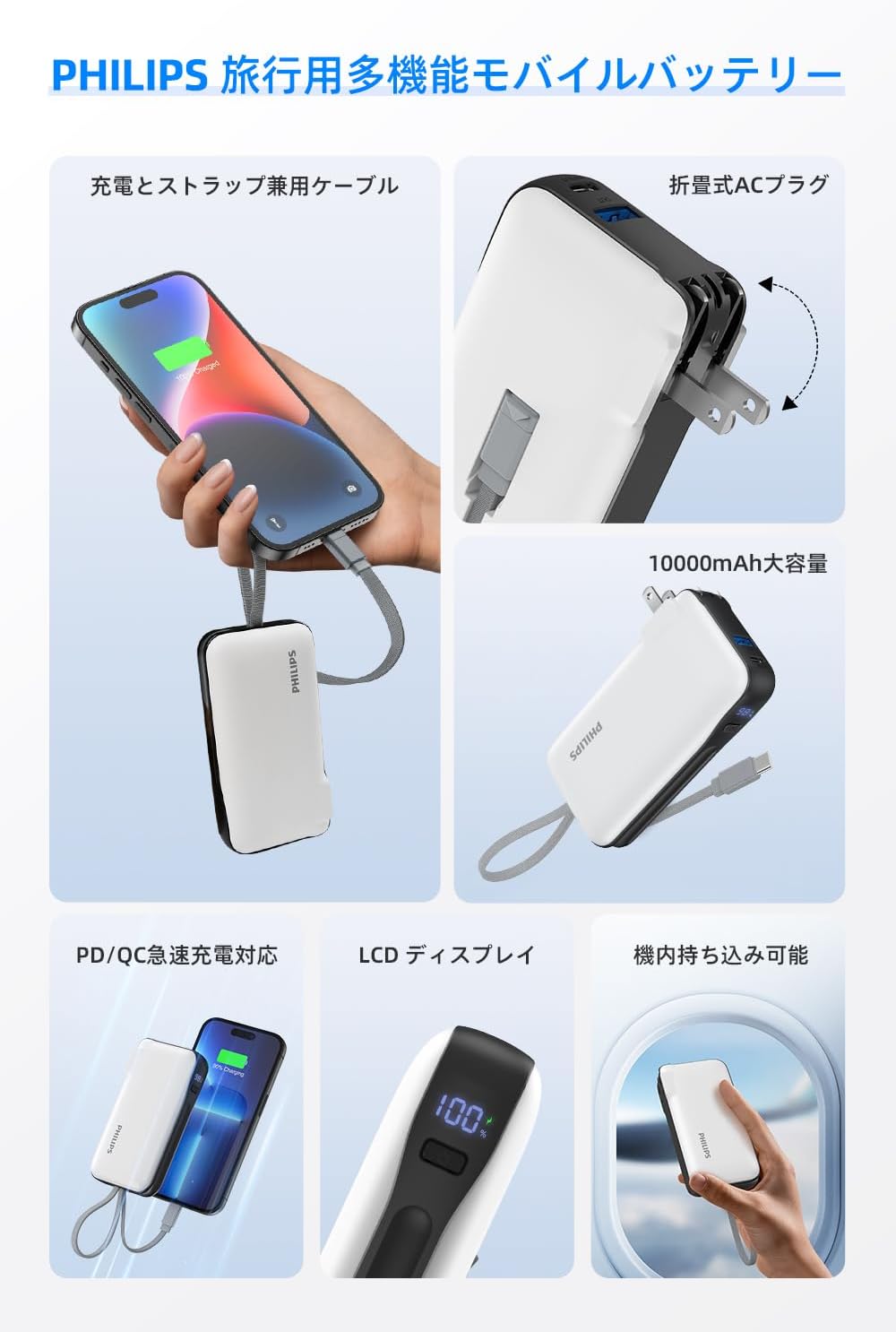 【1点10%~2点12%OFF】Philips(フィリップス) モバイルバッテリー コンセント一体型 10000mAh ACプラグ付き 大容量 携帯充電器 PD 20W出力 3台同時充電 折りたたみ式/Type-Cケーブル内蔵/パススルー機能/ディスプレイ搭載/アダプター変換可能 PSE認証済 ホワイト