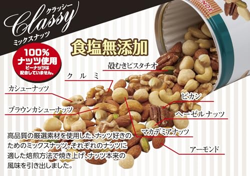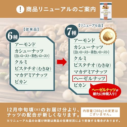 -/360グラム (x 1)/-・パッケージ個数:1・原材料:アーモンド カシューナッツ クルミ ピスタチオ ヘーゼルナッツ マカデミアナッツ ピカン商品紹介 ナッツだけを使用したこだわり厳選ミックスナッツ缶です。食塩無添加なので、ナッツ本来の旨みをお楽しみ頂けます。 アーモンド・カシューナッツ(2種類)・クルミ・マカデミアナッツ・ピカン・ヘーゼルナッツ・剥き身のピスタチオをミックスしたナッツ100%の商品です。 美味しいナッツを楽しんで頂くため、それぞれのナッツに適したローストをしています。カシューナッツはローストの異なる2種類を使用。茶色はカリッとした食感と香ばしい甘さを、白色はコクのある甘さをひきだしています。 原材料・成分 アーモンド、カシューナッツ、クルミ、マカデミアナッツ、ピカン、ピスタチオ ご注意(免責)>必ずお読みください ピスタチオのうす皮の下からあらわれる緑色はピスタチオ独自のものでカビではありません。 ◎開缶後は湿気やすくなりますので、お早めにお召し上がりください。 ◎品質保持のために脱酸素剤を入れております。脱酸素剤は食べれませんので開缶後はお捨てください。 ◎本品製造工場では、落花生、小麦、乳、卵、エビを含む製品を生産しています。※配送に関しての重要事項※・ギフト梱包、のし等は不可となります。・お客様都合で商品発送作業以降のキャンセル不可となります。・弊社提携先倉庫からの発送商品は配送システムを一元管理しており、輸送箱に異なるサイトのロゴが記載されている場合がございます。その為、配送間違いと思われる場合もございますがお受け取りいただきます様お願い致します。※不在時の場合も同様の不在連絡票(再配達)となります。・領収書の発行はシステム上ご注文履歴からお客様ご自身での発行となります。※その他重要事項※商品はメーカーリニューアルが行われた場合、順次パッケージ変更品等でのお届けとなります。商品画像が旧パッケージ等の場合がございますがご了承頂きますようお願い申し上げます。
