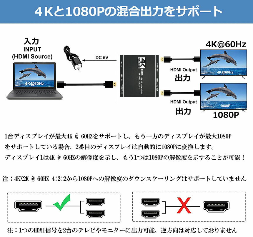 4K 60Hz HDMIスプリッター1入力2出力は、1つのHDMI入力信号(Roku、TV Box、Xbox、Apple TV、PS5 1080p120Hzなど)を2台のHDMIディスプレイ(テレビ、モニター、プロジェクターなど)へ出力できます。 ビデオとオーディオを同時にコピー/ミラーリングします。 EDID管理、スケールダウン機能を搭載。 注:拡張機能はサポートされていません。ミラーのみがサポートされています。ビデオオーディオ---HDMI2.04K60Hz 4:4:4 8ビット18Gbps、HDR D-o-l-b-yバージョンHDCP2.2、HDCP2.3 1080p @ 120Hz / 60Hz 3D、3840x2160 @ 60Hz、1440p @ 60Hz、IMAX DIGITAL(2K-4K) 、HDMIスプリッター4KコンバーターバイパスHDCP D-o-l-b-y Atmos、デジタル7.1CH、DTS:Xオーディオ。設定-HDMI2.0ケーブルが必要です(3M未満)-4Kと1080P TVは同期して動作します:EDID コピーモードとSCALER2をオンにしてから、4KTVと出力1および1080PTVを出力2に接続します。 (EDIDコピー1を優先)-4KHDRとD-o-l-b-yAtmosは同期して動作します:スプリッターEDIDを4K 7.1に設定し、HDMIソースビデオ4K HDR / HDR10 / D-o-l-b-y Vision、オーディオビットをD-o-b-l-y Atmosに出力し、4KTVをスプリッターで分配可能、出力1-1080。 PTVと1080PTVは同期して動作します:EDID2Kモードを設定します注意-D-o-l-b-yAtmosとD-o-l-b-yVisionの両方を入手するには、テレビと受信機が両方をサポートしていることを確認してください。 --- TV 4K 60Hz HDRビデオ、サウンドバー7.1インチオーディオ再生を一緒にサポートします。 - 4K HDMI 2ウェイスプリッター(TV用)、HDMI 2.0 HDCP 2.2 / HDCP 2.3デバイス、N-v-i-diaシールド、Xfinityボックス、ゲームビデオキャプチャ、Xbox one S、Chromecast、google tv、Apple TV、PS4 Pro、Fire TV Streamingメディアプレーヤーなど?SonosARCでは使用できません。eARCは使用できません。HDRをSDRに変換できません。 CECはありません。 VRRはありません。パッケージに含まれるもの:1 x HDMIスプリッター、1 x Micro-USBケーブル、1x英語マニュアル