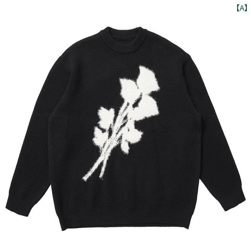 ニット メンズ 男性用 レトロ ローズ柄 ジャカード プルオーバー トップス 秋冬 綿 ポリエステル ブラック ゆったり リラックス カジュアル