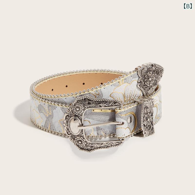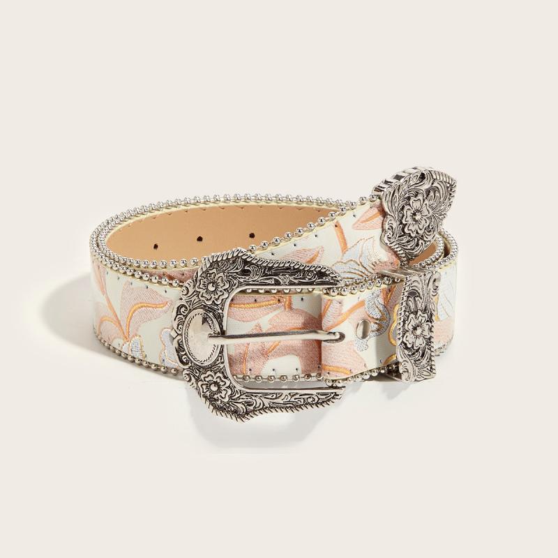 ベルト レディース ファッション 花柄 ウエストベルト ビーズ飾り 個性的 PUレザー 合金バックル 黒 グレー 白 灰色 水色 金色 薄ピンク 幅広 普段使い おしゃれ