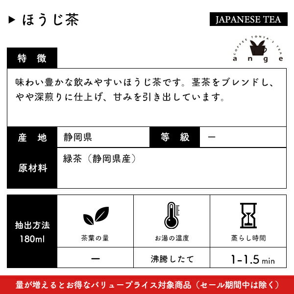 ※在庫状況、お届け時期によりパッケージが異なる場合がございますので、あらかじめご承知おきください。 茶葉の説明 味わい豊かな飲みやすいほうじ茶です。茎茶をブレンドし、やや深煎りに仕上げ、甘みを引き出しています。 おすすめの淹れ方(-) 茶葉の量 湯温 蒸らし時間 -沸騰したて1〜1.5分 商品詳細 品名 ほうじ茶 原材料名 緑茶(静岡県産) 原産国 日本 内容量 200g 賞味期限 180日以上の商品をお届けします 保存方法 高温多湿を避けて保存してください 販売者 株式会社フレッシュロースター珈琲問屋