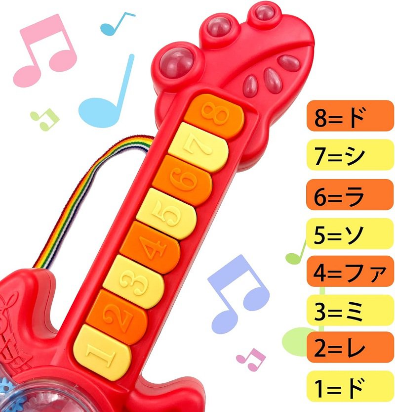 はじめての楽器遊び♪単三電池3本(別売り)を入れて、かっこいいライトが音に合わせて光ります。このギターおもちゃをきっかけに、子供が音楽に興味を持つようになることもあります。 子供向け♪プラスチック製だから、軽くて遊びやすく、持ち運びが簡単なミニギターです。弦をピアノのようなボタンに替わって、より簡単に音調を認識できます。 ストラップ付♪座っても立ってもプレーできるように、背負う用のストラップが付いています。(※長さは約30センチ) 子供の成長に♪想像力を発揮して、色んな曲を弾きながら、お子様の集中力が高め、手の器用さを鍛えることができます。 子供へのプレゼントにおすすめ?面白い子供用のギター、暇つぶし、誕生日プレゼント、ハロウィン、クリスマスギフトなど、お子さま、お孫さまの贈り物に最適です。対象年齢:6歳以上。 メーカー希望小売価格はメーカーサイトに基づいて掲載しています