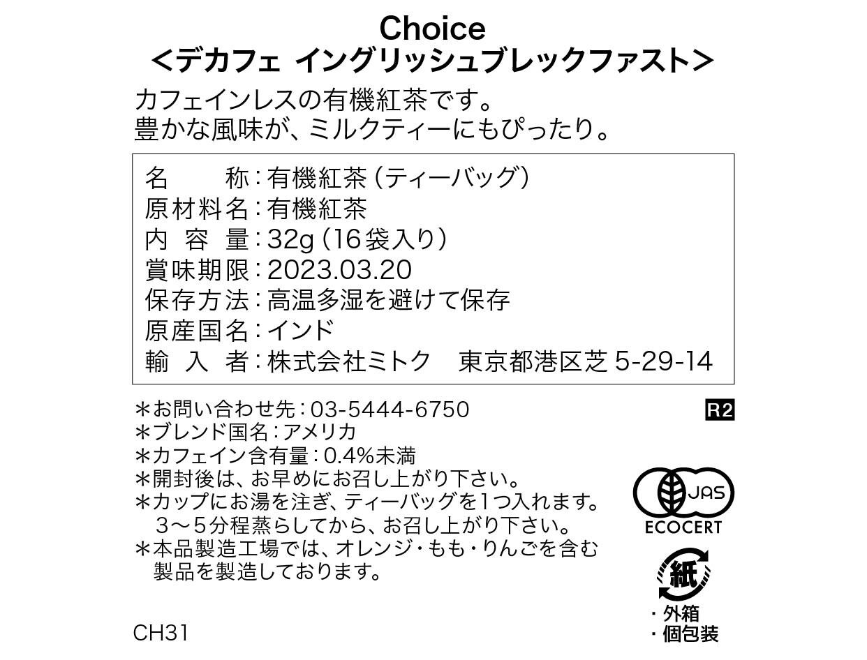 イングリッシュブレックファストの美味しさはそのままの、カフェインレスの有機紅茶です。豊かな風味が、ミルクティーにもぴったり。 本品は、フェアトレード商品です。 【チョイス・オーガニックティー】 チョイス社は、1989 年に米国で一番最初にオーガニックティーを誕生させた会社です。パッケージは漂白されていない再生紙やダイオキシンの発生しないフィルムを使用したり、生産施設で使用される電力は風力発電によるものを購入したりと、自然環境にビジネスの足跡を出来るだけ残さないように配慮しています。フェアトレードにも積極的に取り組んでいます。 2010 年7 月、チョイス社の「Choice Organic Teas」の全ての商品は、NON-GMO Project 認証マークを取得しました。 これは、遺伝子組み換え原料を含まない、またはその割合が極めて低いと認められた食品に与えられるマークです。 遺伝子組み換え食品(GMO)食品は農作物の遺伝子情報を操作することで生産性を高められるメリットがありますが、一方で食品や環境に関する安全性の問題から、強い不安や反発もあり、遺伝子組み換え原料の使用を抑えたNon-GMO 食品に人気が集まっています。 名 称:有機紅茶(ティーバッグ) 原材料名:有機紅茶 内容量:32g(16袋入り) 保存方法:高温多湿を避けて保存 原産国名:インド 輸入者:株式会社ミトク 東京都港区芝5-29-14 *ブレンド国名:アメリカ *カフェイン含有量:0.4%未満 *開封後は、お早めにお召し上がりください。 *カップにお湯を注ぎ、ティーバッグを1つ入れます。 3~5分程蒸らしてから、お召し上がりください。 *本品製造工場では、オレンジ・もも・りんごを含む 製品を製造しております。