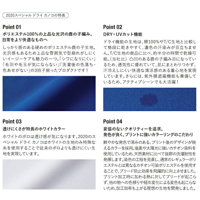メーカー希望小売価格はメーカーカタログに基づき掲載 セール SALE バーゲン クリアランス 激安 特価は商品タグより安い場合に掲載 最安値挑戦 大き目 大きい ビックサイズあり【素材】ポリエステル100% 鹿の子シワが付きにくく、乾きやすい、繰り返し洗っても色落ちしにくいイージーケアポロポリエステル鹿の子を使用した、さっぱりとしたドライタッチの生地。表地は上品な光沢となめらかな風合いで肌ざわりも良く、汗冷えしにくいので快適なウェアで最高のパフォーマンスを実現。ホワイトの生地には透け感を軽減させるため特殊な糸を使用。そして、シワが付きにくく、乾きやすい、繰り返し洗っても色落ちしにくいイージーケアが何よりも魅力。※襟はリブ仕様※ホワイトの生地は着用時の透け感を軽減させるため特殊な糸を使用しております。そのため生地の風合いが他カラーより柔らかくなります。サイズ XS S M L XL XXL XXXL XXXXL 5XL身丈 60 65 68 71 74 77 80 83 85身幅 43 48 51 54 57 60 64 68 73肩幅 41 45 47 49 51 54 57 60 63袖丈 19 20 21 22 23 25 26 27 28モニターにより色味に誤差が生じます。メーカー受注発送品の為、キャンセル返品交換不可
