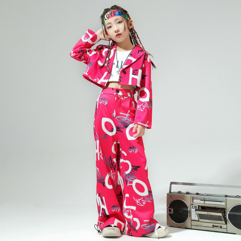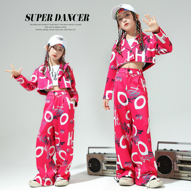 キッズ ロック ダンス衣装 セットアップ 女の子 へそ出し 長袖 ジャケット ロングパンツ スーツ パンツスーツ ローズ 総柄 ダボダボ 韓国K-POP 演出服 舞台服 発表会 ポッピング jazz ジャズダンス ステージ レッスン着 子供服 大きいサイズ かっこいい おしゃれ