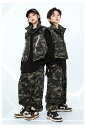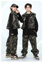 キッズ ダンス衣装 迷彩 セットアップ 女の子 男の子 k-pop衣装 トップス パンツ カーゴパンツ ベスト 練習着 緑 グリーン 黒 ジャズダンス ヒップホップ 子供 かっこいい ロング丈 ストリート カモフラージュ kpop 団体服 ジュニア 応援団 イベント 発表会 文化祭 演出服