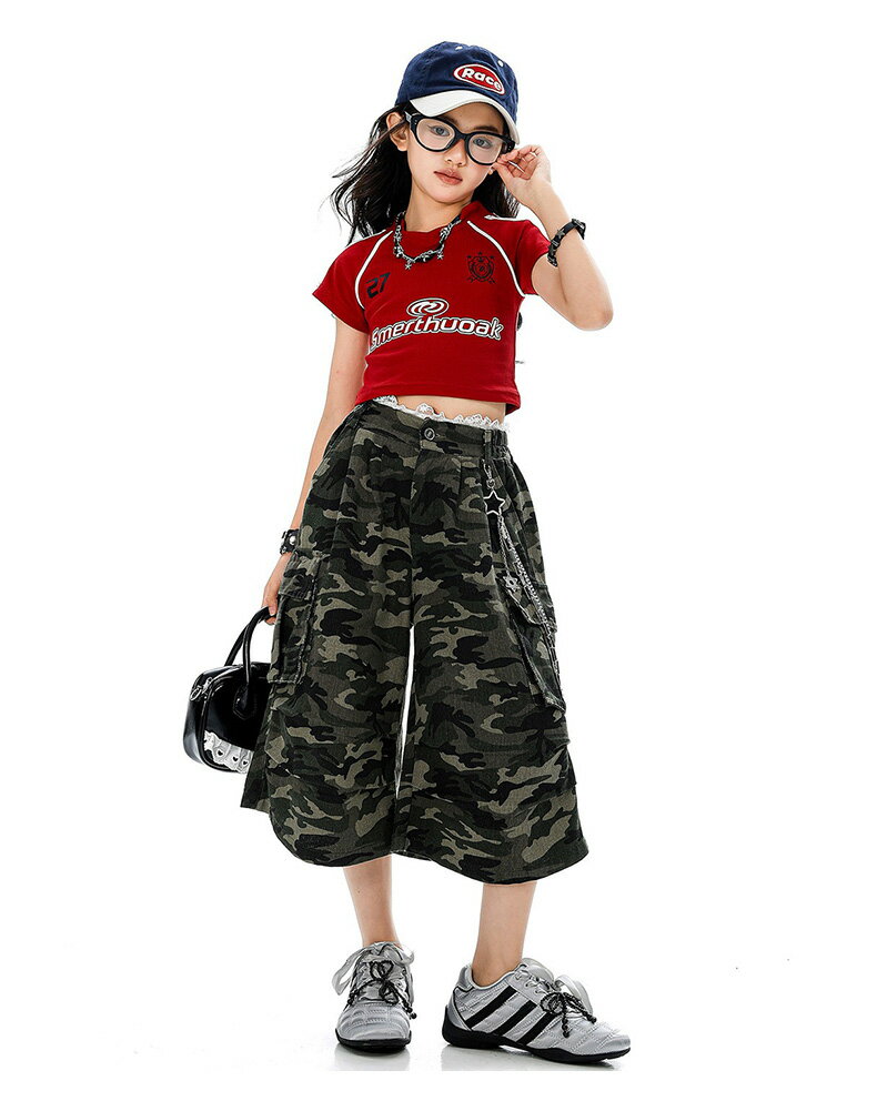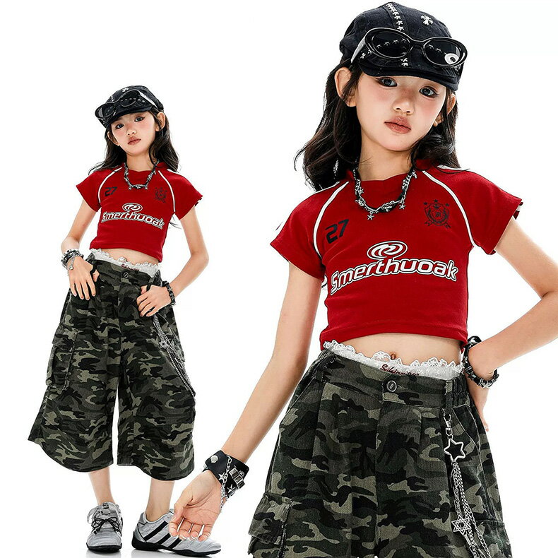 迷彩柄 へそ出しシャツ チアガール キッズ ダンス衣装 セットアップ ヒップホップ ストリート 女の子 半袖 トップス 短パン ショーツ レッド グリーン 子供服 韓国kpop hiphop 女の子 ダンスウェア 原宿系 発表会 演出服 練習服 応援団 舞台服 かっこいい おしゃれ 110-180cm