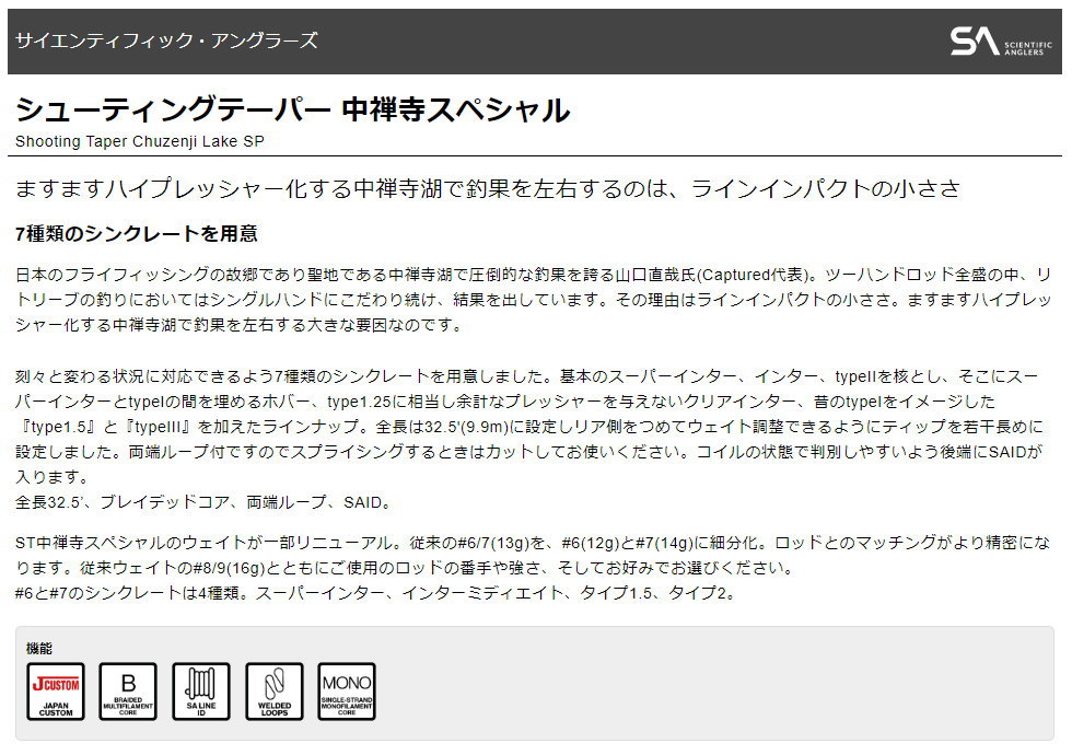 ※当店在庫切れの場合:お取り寄せ納期2〜7日頂いております。 当店在庫品につきましては、土日祝日を除き1〜3日程で発送となります。在庫切れで商品がお取り寄せとなりました場合、2〜7日以内に発送出来る様に努めさせていただいております。お急ぎの際は、事前にメールまたはお電話にて、お問合わせ下さい。 在庫管理には十分注意しておりますが、ご注文タイミングにより、万が一当店・メーカー共に在庫欠品の場合には、ご連絡の上キャンセルさせていただくことがございますので何卒ご了承ください。ますますハイプレッシャー化する中禅寺湖で釣果を左右するのは、ラインインパクトの小ささ 7種類のシンクレートを用意 日本のフライフィッシングの故郷であり聖地である中禅寺湖で圧倒的な釣果を誇る山口直哉氏(Captured代表)。ツーハンドロッド全盛の中、リトリーブの釣りにおいてはシングルハンドにこだわり続け、結果を出しています。その理由はラインインパクトの小ささ。ますますハイプレッシャー化する中禅寺湖で釣果を左右する大きな要因なのです。 刻々と変わる状況に対応できるよう7種類のシンクレートを用意しました。基本のスーパーインター、インター、typeIIを核とし、そこにスーパーインターとtypeIの間を埋めるホバー、type1.25に相当し余計なプレッシャーを与えないクリアインター、昔のtypeIをイメージした『type1.5』と『typeIII』を加えたラインナップ。全長は32.5'(9.9m)に設定しリア側をつめてウェイト調整できるようにティップを若干長めに設定しました。両端ループ付ですのでスプライシングするときはカットしてお使いください。コイルの状態で判別しやすいよう後端にSAIDが入ります。 全長32.5’、ブレイデッドコア、両端ループ、SAID。 ST中禅寺スペシャルのウェイトが一部リニューアル。従来の#6/7(13g)を、#6(12g)と#7(14g)に細分化。ロッドとのマッチングがより精密になります。従来ウェイトの#8/9(16g)とともにご使用のロッドの番手や強さ、そしてお好みでお選びください。 #6と#7のシンクレートは4種類。スーパーインター、インターミディエイト、タイプ1.5、タイプ2。