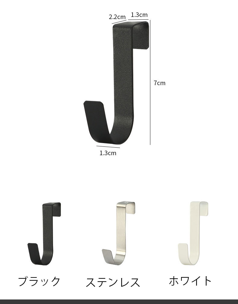 ご注意 ※ご覧いただくブラウザやモニターの機種と設定によって、実物の色が商品画像と若干異なる場合がございますので、予めご了承ください。 商品詳細 特徴 【製品仕様】:ドアハンガー10個組、7cm*2.2cm*1.3cm,カラー:ブラック、 ホワイト 、ステンレス。厚さが約1.5~2cmまでの戸棚のドアや折れ戸に使用可能、扉と上部の隙間は約2mm以上が必要です。 【取り付け簡単】穴あけやネジ締めが不要で、扉の上やキッチン収納の取っ手に嵌めるだけでしっかりと設置できます。場所を変えたいときにすぐに取り外せるので、広く使うのに邪魔にならないアイテムです。 【便利に収納】S字型設計,よく使う衣類やバッグなどの収納に最適です。 ドアにかければコートなども簡単に掛けられ。 【高品質素材】高品質の鋼材で作られ。錆びにくく、丈夫で長持ちします。ドアや衣類にダメージなくご安心にお使い頂けます。 【マルチシーン使用】キッチン、バスルーム、寝室、オフィス、。必要なものをどこにでもかけることができるので、部屋の収納にスマートに対応できます。