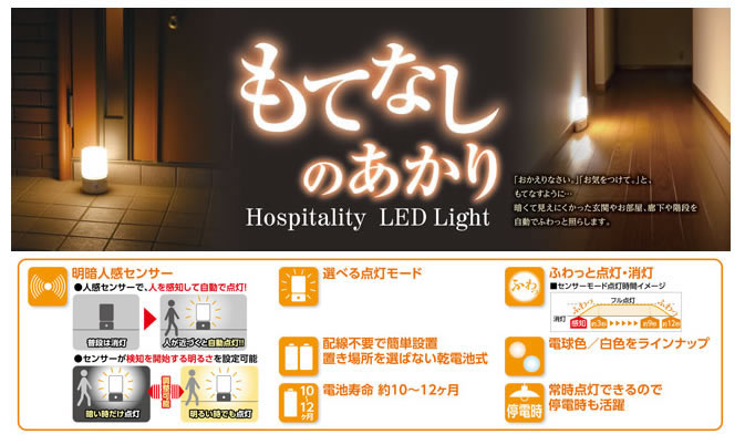 HLH-1202(DB)もてなしのあかり Hospitality LED Light 据置(大)明暗人感センサー付 白色 電池別売ELPA 朝日電器 照明器具