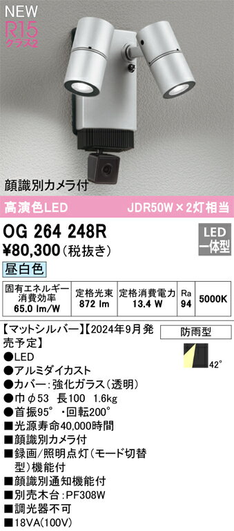 OG264248Rエクステリア LEDスポットライト MINIMALR15高演色 クラス2 42°ワイド配光顔識別カメラ付 JDR50W×2灯相当 昼白色 非調光オーデリック 照明器具 アウトドアライト 屋外用