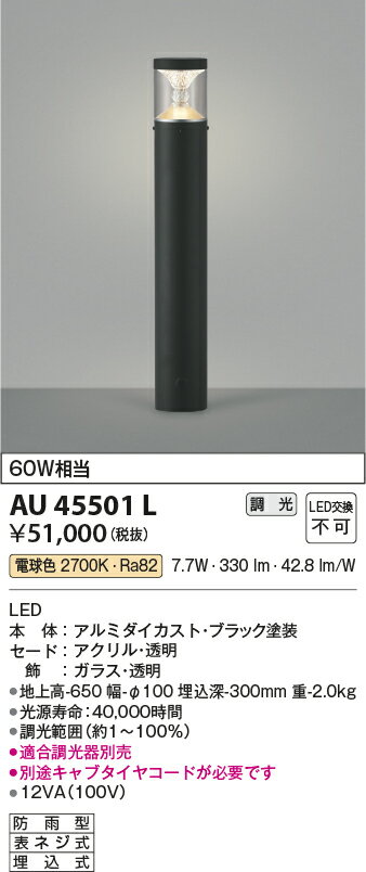 ◆きらめくガラスの表情が華やかさと高級感を演出します。白熱球60W相当ランプ:LED●アルミダイカスト・黒色塗装●アクリル・透明●飾:ガラス・透明●地上高-650 幅-φ100 埋込深-300mm 重-2.0kg●消費電力:7.7W●色温度:2700K●演色性:Ra82●定格光束:330 lm●固有エネルギー消費効率:42.8 lm/W●光源寿命:40000時間●調光範囲(100%〜約1%)●別売調光器〔AE36745E〕防雨型検索用カテゴリ9検索用カテゴリ【LED照明】 【電球色】 【調光可】 【防雨】