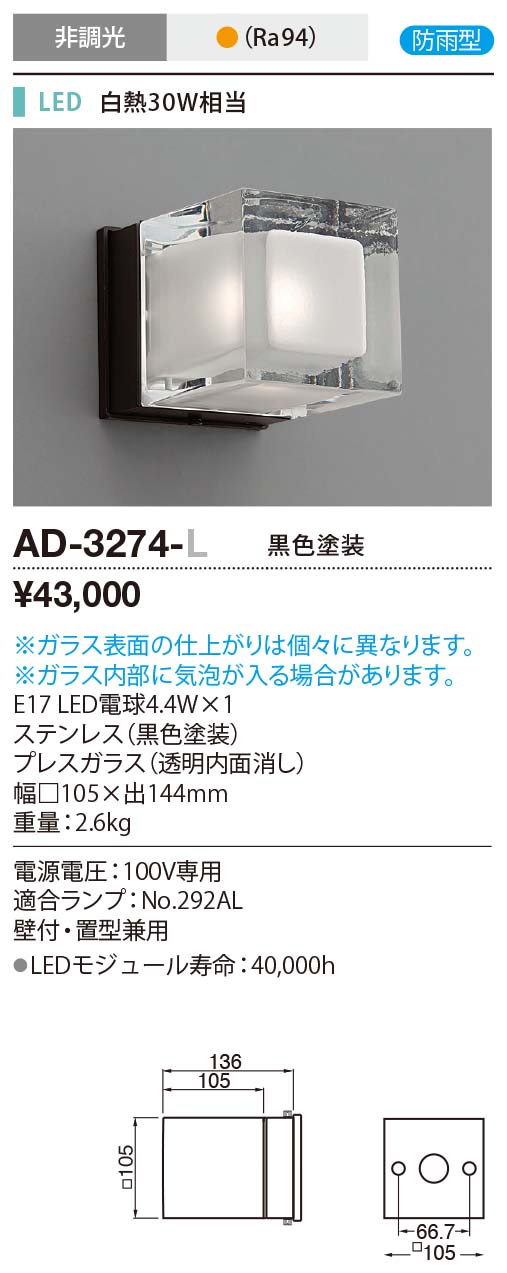 ランプ別売※ガラス表面の仕上がりは個々に異なります。※ガラス内部に気泡が入る場合があります。E17 LED電球4.4W×1ステンレス(黒色塗装)プレスガラス(透明内面消し)幅□105×出144mm重量:2.6kg電源電圧:100V専用適合ランプ:No.292AL壁付・置型兼用【LED照明】 【ランプ別売】 【非調光】 【防雨】検索用カテゴリ9