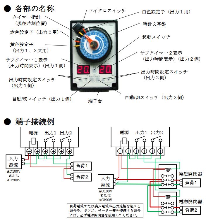 ●文字時計盤に設定子を差し込み、サブタイマーの時間を設定することで、任意の時刻に設定した時間だけ出力します。出力は2系統あり、それぞれ個別に設定することができます。●温室が2つ。または畝が2つで水まきしたい。または、午前と午後で水やりの時間を変えたい時に。作物の種類や成育状況に応じた水管理が出来ます。【仕様】24時間タイマー:シンクロナスモーターによる駆動サブタイマー:マイクロコンピューターによる制御出力:接点出力(1a×2回路)出力定格:抵抗負荷 AC250V 7A最小設定時間間隔:45分停電補償:24時間タイマー なし、サブタイマー設定 10年間電源:AC100V(±15%) 50/60Hz(製品裏面で手動切替)動作周囲温度:-10℃〜50℃動作周囲湿度:35%RH〜85%RH(結露しない事)外形寸法:縦150×横96×高70mm質量:約530g付属品:取付ビス(3.1×16)3本、白色設定子3本、赤色設定子3本、黄色設定子3本検索用カテゴリ624
