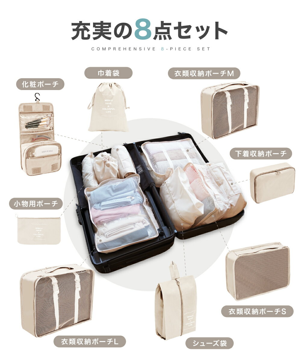トラベルポーチ 8点セット 旅行前のお悩み解決! スーツケース内をどうやって整理したらいいのかわからない パッキングが苦手or面倒な方 パッキングに適した収納ポーチをお探しの方 スーツケースに入れるだけでキレイに整頓 収納が苦手な方でも大丈夫! 荷物をスッキリと整理し、気持ちの良い旅をしましょう! 日常生活でも大活躍! ご自宅で様々なものを整理する整理整頓ポーチとしても重宝 使わない時は1つにまとめてコンパクトに保管 通気性が良いメッシュ生地で蒸れにくい&中身が一目瞭然 タオルや衣類など、しっかりと収納できます! 単体使用でも便利:バッグインバッグとして,シューズの持ち運びに,小物入れに 衣類収納ポーチL・衣類収納ポーチM L&Mサイズの衣類収納ポーチには、バックル付きのベルトが2本付いており、 衣類をしっかりと固定できます。また、フタ部分はメッシュ素材で通気性も抜群です。 衣類収納ポーチS メッシュ素材で通気性がよく、中身が見えるので使いやすい。 フェイスタオルがピッタリ入るサイズ感です。 下着収納ポーチ 衣類収納ポーチと違い、中身が見えないので、下着などの収納に最適です。 小物用ポーチ リップや日焼け止め、モバイルバッテリーなどの収納に便利です。 シューズ袋 スニーカーやサンダル、トレーニングシューズなどの持ち運びにおすすめ。 巾着袋 衣類やタオル、ハンカチ、靴下など入り切らなかった物の収納に。 一つあれば便利な巾着袋です。 吊り下げポーチ 吊り下げられるので、旅行先だけでなく洗面台などでの普段使いにも便利です。 スペック&素材 サイズ 衣類収納ポーチLサイズ:43x30x12cm 衣類収納ポーチMサイズ:32x25x11cm 衣類収納ポーチSサイズ:30x22.5x12cm 下着収納ポーチサイズ:28x20x11cm シューズ袋サイズ:21x10x34cm 巾着袋サイズ:36x27cm 化粧ポーチサイズ:24x19x8cm 小物用ポーチサイズ:27x16cm ※手作業による測定をしているため、多少の誤差は生じてしまいます。予めご了承ください。 カラー ベージュ、ピンク、ブラック、グレー、ネイビー、ブルー 素材 本体:ポリエステル 原産国 中国 メーカー品番 4573553693594 注意事項 ■画像はなるべく実物に近いよう撮影しておりますが光の加減や、各御家庭でのPC環境によって色合いが異なる場合がある事をあらかじめご了承下さい。 ■手作業にてサイズを計測しておりますので、2-3cmほどの誤差がある可能性がございます。 イベント一覧 1月 福袋 お年玉 正月 初詣 新年 仕事始め 成人の日 成人 成人式 2月 節分 バレンタイン バレンタインデー バレンタインデイ 3月 ひな祭り ホワイトデー ホワイトデイ 卒園式 卒園 卒業式 卒業 4月 入園式 入学式 入社式 進級 5月 GW ゴールデンウィーク ゴールデンウイーク 端午の節句 子供の日 こどもの日 子どもの日 母の日 6月 父の日 ジューンブライド 7月 七夕 夏休み お中元 夏ギフト サマーギフト 暑中見舞い 8月 お盆 帰省 残暑見舞い 9月 新学期 運動会 体育祭 敬老の日 10月 ハロウィン ハロウイン ハロウィーン ハロウィーンパーティー 11月 勤労感謝の日 七五三 12月 クリスマス クリスマスプレゼント クリスマスイブ イブ 忘年会 お歳暮 冬ギフト 仕事納め 大納会 キーワード トラベルバッグ トラベル 圧縮バッグ 圧縮袋 旅行 圧縮袋 衣類 圧縮袋 服 圧縮 ファスナー 旅行 圧縮 トラベル 衣類収納ケース 圧縮 トラベルポーチ 収納 衣類 収納袋 衣類 衣類収納ポーチ 衣類収納袋 衣類圧縮袋 旅行 衣類収納 旅行 便利グッズ 圧縮 旅行 便利グッズ トラベルポーチ 旅行 収納 ポーチ 旅行グッズ 旅行 ポーチ ポーチ 大きめ 海外旅行 便利グッズ スーツケース トラベルグッズ 圧縮収納ポーチ 旅行用圧縮袋 トラベルポーチ 圧縮バッグ 収納ポーチ ファスナー 圧縮で衣類スペース50%節約 軽量 出張 旅行 便利グッズ 衣類仕分け 簡単圧縮 トラベルバッグ トラベル 圧縮バッグ 圧縮袋 衣類 服 圧縮 ファスナー 旅行 圧縮 衣類収納ケース 圧縮 トラベルポーチ 収納袋 衣類収納ポーチ 衣類収納袋 衣類圧縮袋 衣類収納 便利グッズ 便利グッズ 収納 ポーチ 旅行グッズ 大きめ 海外旅行 便利グッズ スーツケース トラベルグッズ 便利グッズ 袋 あっしゅく袋 トラベルグッズ 布団 旅行圧縮バッグ 旅行用 旅行ポーチ 衣類乾燥袋 洗濯袋 衣装ケース メンズ スーツケース 小分け袋 海外出張 旅行荷物バッグ 旅行包 収納製品 バックパック 旅行用小分けポーチ 整理 travel bag ピッキングバッグ 出張荷物ポーチ 布団収納袋 旅行グッズ 圧縮ポーチ 旅行用ポーチ しゅうのう袋 出張 旅行用洋服収納 掃除機不要 トラベルセット ドライバッグ 入院グッズ 旅行用バッグ パッキング パッキングポーチ 飛行機 スペース かわいい 下着 圧縮袋セット キャンプ 繰り返し使える 着物 tシャツ 保管 ファスナー 圧縮 バッグ 一泊 濡れたタオル 母の日 プレゼント 母の日ギフト 恋人 友達 キッズ 子供 父 母 プレゼント ギフト 敬老の日 バレンタイン バレンタインデー ホワイトデー 卒業式 入学式 母の日 父の日 敬老の日 クリスマス Xm