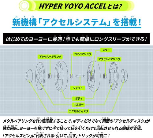 ★ハイパーヨーヨーアクセルとは? ・本体を手に持った状態でストリングを勢いよく引くことで、本体を 投げずに高速回転させることができる日米で特許出願済の新機能 「アクセルシステム」を搭載したハイパーヨーヨーシリーズです! ・本機能を搭載したことにより、従来のヨーヨーでは再現不可能な 新たなトリックが可能となりました! ・メタルベアリングを計3個搭載することで、ボディだけでなく、 両面の「アクセルディスク」が独立回転! ・3か所が回転することにより、ヨーヨーを投げずに手に持った状態で 高速回転させることができる機構が実現! ・「アクセルスピン」に代表される「引いて、回す」トリックが 可能に! ★特徴 ・『HYPER YOYO ACCEL』より、「アクセルループ」が登場! ・「アクセルループ」は溝幅が狭く、薄型のため、手もとに返って きやすく、「ループ・ザ・ループ」などのルーピングトリックに 最適な機種です! ・手で持って回す"アクセルシステム"も搭載しています! ・「ハイパーヨーヨーアクセル アクセルループ-ファニーバニー-」は、 クリアイエローと水色のボディに飛び回るウサギのデザインが あしらわれたヨーヨーです! 【推奨トリックレベル】スーパーレベル~ハイパーレベル 【推奨トリックタイプ】ルーピングトリック ★セット内容 本体1 ★メーカー バンダイ ★パッケージサイズ(mm) 180×110×50 ★電池 不要 ★玩具安全基準 合格 ★対象年齢 8才以上 <検索ワード> おもちゃ/玩具/プレゼント/お祝い/お誕生日/誕生日プレゼント/バースデープレゼント/クリスマス/クリスマスプレゼント/ギフト/入園祝い/入学祝い/出産祝い/孫/ひなまつり/こどもの日/孫の日/パーティー/家族/新品/知育玩具/学習玩具/室内遊び/おすすめ/子供/ベビー/キッズ/男の子/女の子/ラッピング無料/包装無料/