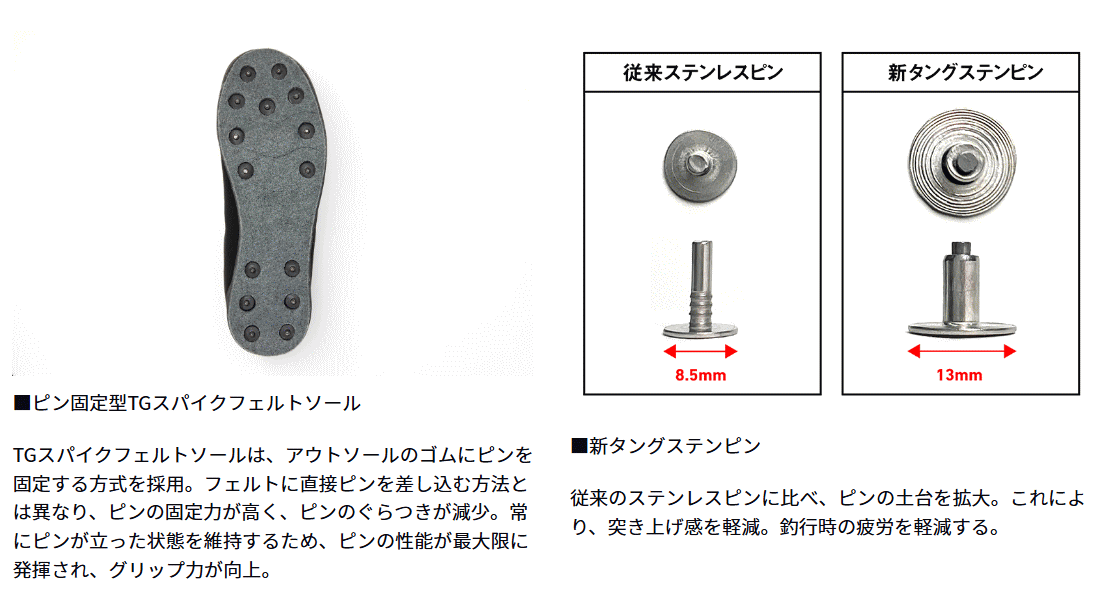 商品情報 ダイワ DAIWA グローブライド 磯釣り ルアー 釣り フィッシング フェルトスパイク 靴 シューズ 瀬川良太監修モデル。 ロックショアフィッシングに必要な機能性を徹底的に追求したTGロックショアシューズ。 悪い足場の磯で最も重要なグリップ性能を向上させるため、タングステンピンを採用。タングステンは従来のステンレスピンよりも高い硬度を持ち、しっかりと磯にグリップする。 また、ピンの土台を従来のステンレスピンの約1.5倍に拡大し、突き上げ感も軽減。 さらに、今回のTGスパイクフェルトソールは、フェルトにピンを固定するのではなく、アウトソールのゴムにピンを固定する方式を採用。 この設計により、ピンのぐらつきを減らし、地面に対して常にピンが立った状態をキープ。ピンの性能が最大限に発揮され、グリップ力が向上した。 アッパーには乾きやすく通気性の高いメッシュ素材を使用。足首周りには柔らかく伸びのある素材を使用し、足首の可動域を広げ、歩きやすさを向上させた。 サイドには排水穴を配備しており、靴内部が濡れても水をしっかり排出する。 履き口付近にはシューレースフックを採用しており、脱ぎ履きがしやすくフィット感の調整も簡単。 インソールにはノンスリップ仕様の乾きやすいインソールを採用。靴内部での足のずれを防ぎ、斜面の磯でも驚くほど歩きやすくなった。 本体とアウトソールの間に新型のEVAミッドソールを採用し、履き心地を向上。 長時間釣行の疲れを軽減する。 ■発売年:2025年 ■お買い物の前にご確認ください ⇒ 在庫表示/配送/送料等のご説明