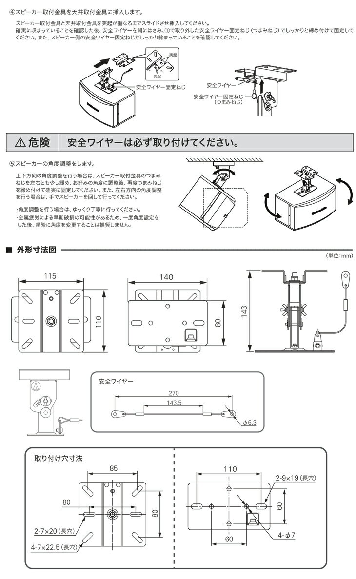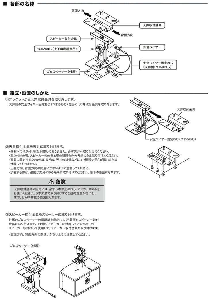 オーディオテクニカ製カラオケスピーカー専用 純正天井吊り用ブラケット、スピーカー吊り金具 設置や調整の利便性、そして安全性を考慮した構造。 思いのままの設置で使用シーンが広がります。 オーディオテクニカ業務用カラオケスピーカー(AT-KSP91、AT-KSP71,72、AT-KSP51,52)に対応。 ●入数:2個1組 ●重量:0.68kg(1台あたり) ●材質:スチール ●首振り角度:垂直方向 5段階ピッチ 0°〜45° ●最大吊り下げ荷重:10kg