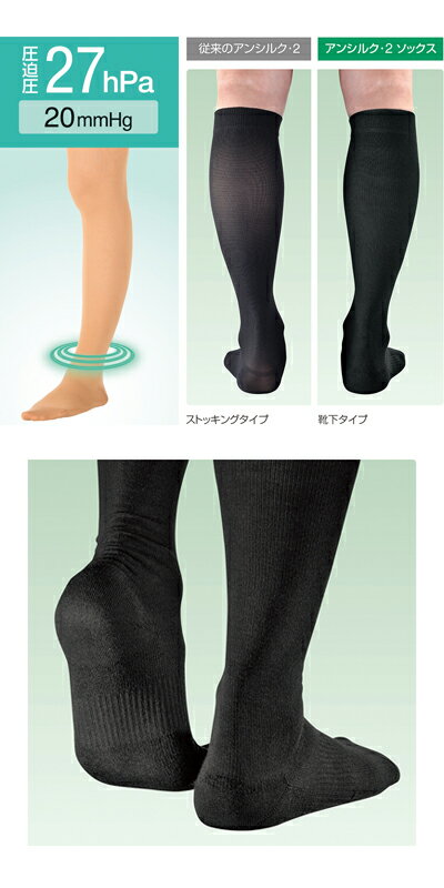 【病院専用商品】 ● アンシルク・2 ソックス(つま先あり) 20113 ブラック M●メーカー名 アルケア●商品説明 ・吸湿性に優れ滑りにくい、綿混素材の靴下タイプの弾性ストッキング。・足首の圧迫圧は27hPa(20mmHg)で、中程度の圧迫が得られます。・綿混素材の靴下タイプで性別を問わず履きやすく、日常生活のさまざまなシーンでお使いいただけます。・アーチ部分に独自の編み構造を施したことで、歩行しやすく、C&G機能の効果を補助します。※適合するサイズが2つあった場合は、足首周囲が適応範囲の中央値に近いサイズをお選びください。●商品仕様 ●サイズ/(足首周囲)S:17〜21cm・M:19〜23cm・L:21〜25cm・LL:23〜27cm、(ふくらはぎ周囲)S:28〜34cm・M:32〜38cm・L:36〜42cm・LL:40〜46cm●素材/ポリエステル、綿、ナイロン、アクリル、ポリウレタン●医療機器番号/13B1X00207000069●生産国/日本●JAN 4900070201139● 衣類 ソックス 着圧ソックス介護 病院 クリニック 診療所 グループホーム 訪問看護 訪問介助 介助 居宅 施設 福祉 インボイス対応 適格請求書 ★お見積りはこちらから★ kt更新日 2025/11/13★月島堂はインボイス対応済!インボイスのご請求書、領収書をご発行可能です。★業界最安値に挑戦!専門店ならではの納得価格。★創業25年の信頼と実績!★多くのお客様に選ばれ、累積受注件数35000件突破!★月島堂は90%以上のお客様にご納得いただいております。★お気軽にお見積もりご依頼下さい★お見積りはこちらから★