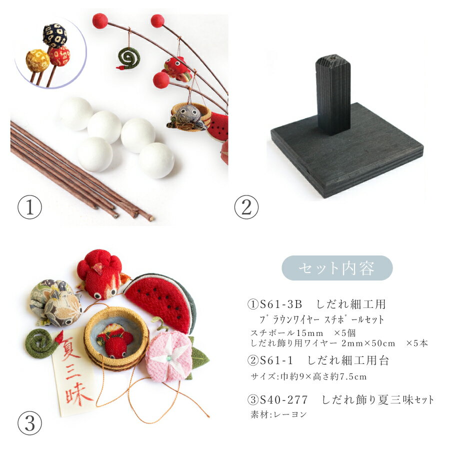 すぐに飾れる、ちりめんのしだれ飾り台夏三昧のお飾りセットです。 ■セット内容 ・S61-3B しだれ細工用 ブラウンワイヤー スチボールセット ・S61-1 しだれ細工用台 W9xH7.5cm ・S40-277 しだれ飾り夏三味セット