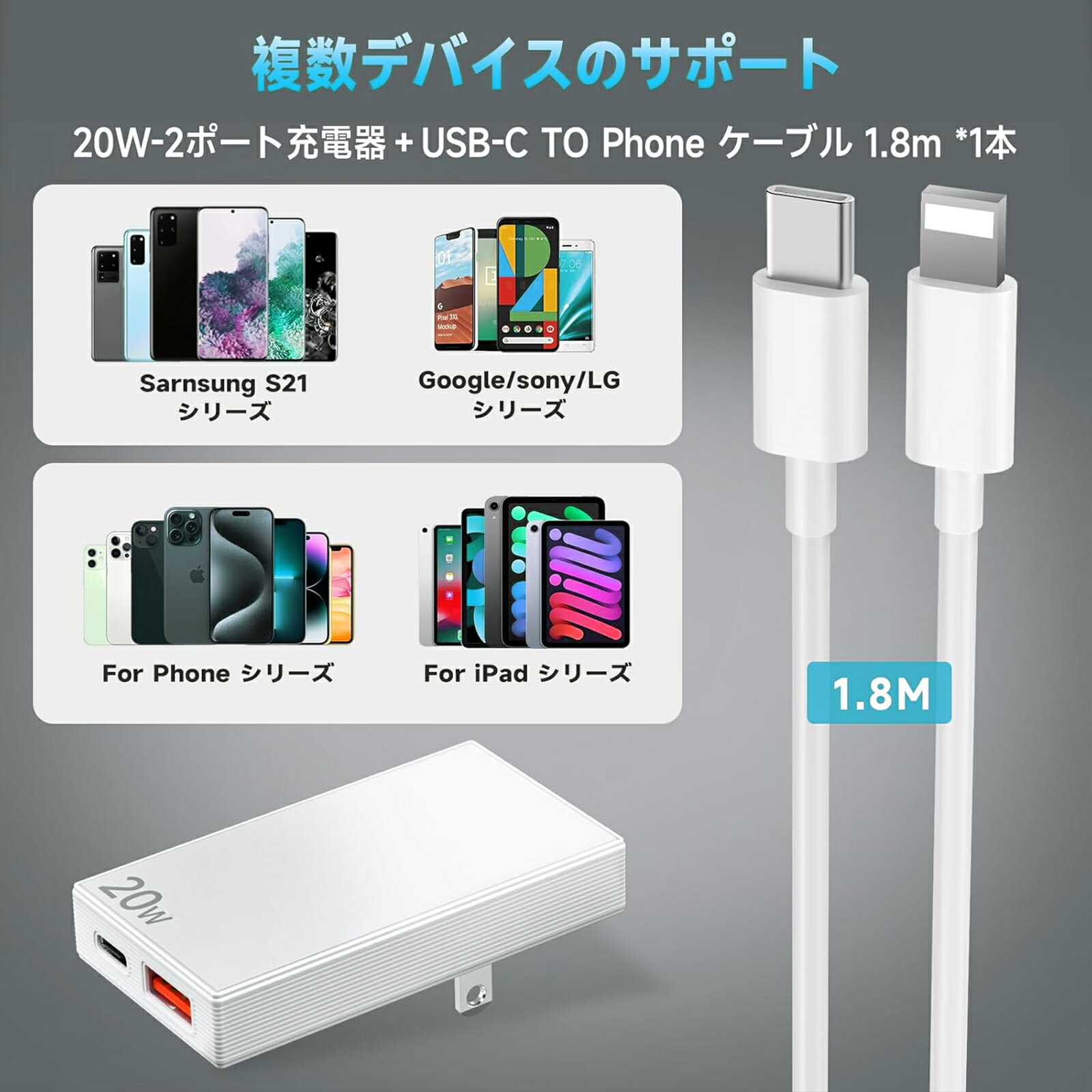 【超薄型設計・折りたたみ式プラグ】この20W急速充電器は最薄部13mmのスリムデザインにより、省スペースでの使用が可能。折りたたみ式プラグを搭載し、持ち運びや収納時もコンパクトで、出張や旅行時に最適です。20W出力でforiPhoneも急速充電できます。 【最大20W出力・2つのポート搭載】単USB-Cポート使用時は最大20Wの高出力に対応し、単USB-Aポート使用時は最大20Wの高出力ができます。2ポート同時利用時はスマート電力分配により、最大15Wで、2つのデバイス同時充電にも効率的に対応します。 【幅広い互換性と利便性】USB Type-C規格に準拠し、スマートフォン、タブレットなど多様なデバイスに対応。急速充電器、スマホ充電器、携帯充電器として幅広く活用できます。1.8mのライトニンケーブルを同梱。柔軟性と耐久性を兼ね備え、スマートフォンやタブレットなどの高出力充電にも安定してご使用いただけます。 【国際電圧対応・安全認証取得】AC100-240Vの入力電圧に対応し、海外利用にも安心。日本国内のPSE認証を取得済みで、過電流保護、過熱防止、ショート防止など複数の保護機能を備え、安全性を重視した設計です。 【 最高サービス】ご購入日から1年以内の初期不良および正常な使用範囲内で発生した故障、破損、その他の不具合があった場合は、各種対応をさせて頂きますのでご安心ください。 お問い合わせの手順は以下の通りです: 1.Amazonの「注文履歴」を開く。 2.該当の商品を購入した販売元を探す。 3.販売元のページに移動し、「質問する」をクリックする。 これにより、お客様の問い合わせを迅速かつ正確に処理することができます。私たちはお客様をサポートするために全力を尽くします。