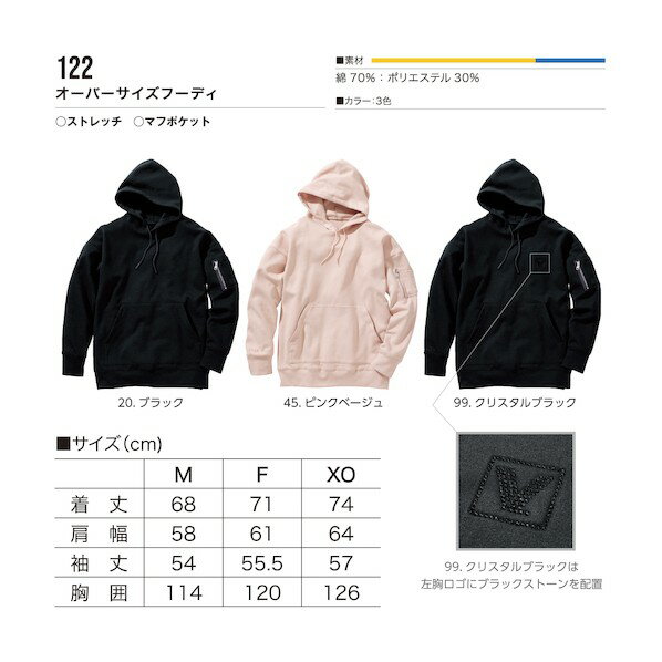 特徴 ■特徴 オン・オフにとらわれなく使用できます。 ストレッチ性が高いソフトでカジュアルなスウェット素材です。 スウェット素材は、動きやすさバツグンでマフポケットや左袖にペン差し付きファスナーポケット機能的なオーバーサイズフーディーです。 ■用途 軽作業に。 アウトドアに。 インドアに。 普段着に。 ■材質 綿70%:ポリエステル30% ■注意点 ※99.クリスタルブラックのみ左胸にロゴが入っています。 仕様 入数 1点 122XO99