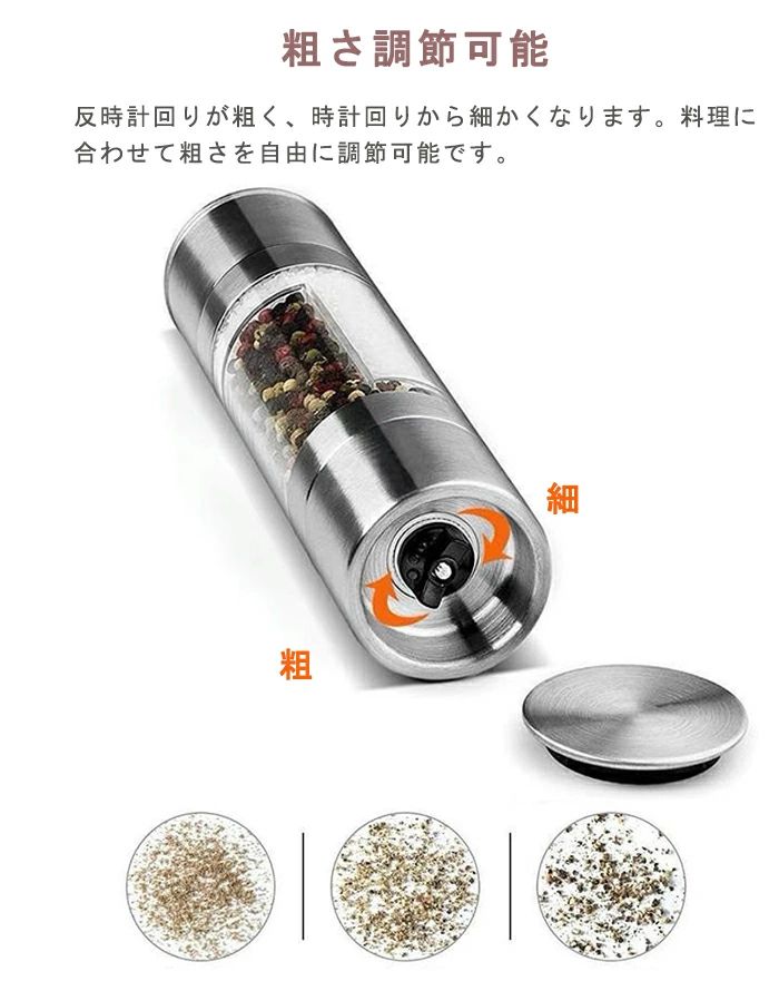 素材:プラスチック、ステンレス鋼など カラー:写真の通り セット内容:本体のみ サイズ:5.2cm*22cm 生産国:中国 【一台2種類のスパイス】 通常のペッパーミルと違い、仕切りデザインを採用して2種類のスパイスを入れる可能、とても便利! 【粗さ調節可能】 反時計回りが粗く、時計回りから細かくなります。料理に合わせて粗さを自由に調節可能です。 【セラミック研削コア】 高強度セラミック研削コア、耐摩耗性、耐腐食性が備えて健康的で環境にやさしい、安心感を与え、優 れた研削精度をもたらします 【透明設計】 透明なアクリル素材でできており、スパイスの挽き方をはっきりと観察し、添加量を把握できるので、 手触りと視界が二重に楽しめます! 【お手入れ簡単】 取り外し可能なボディデザイン、本体を各方向に掃除できるので、水洗いOK、清潔に保ち、長期間使 用できます! 【キッチンに欠かせない】 新鮮な粒胡椒、岩塩、花椒、ブラックペッパーなどを楽しむことができます。 ※使い方は商品ページにある動画をご参考いただけます。