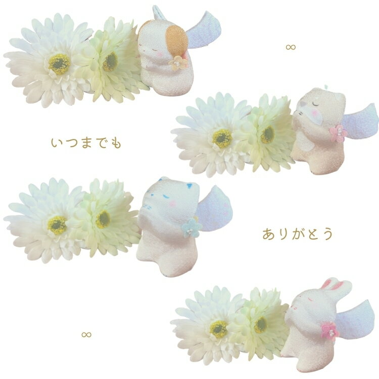 商品詳細 商品名 お祈り天使の子 素材 レーヨンちりめん 生産地 日本 ご了承ください 手作り品の為、一点ごとに風合いが異なります。 写真と、お色味が若干異なる場合がございます。どうぞご了承ください。 関連ワード:ペット 仏具 仏壇 かわいい 虹の橋 コンパクト ペット用品 犬 猫 ウサギ ペットメモリアル【お祈り天使の子】 ひとつひとつ、手作りでつくられた「お祈り天使の子」 ちりめん素材の日本製です。 大切な”うちの子”へ、永遠の「ありがとう」を一緒にお祈りしてくれます。