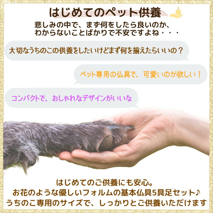 商品詳細 サイズ ■仏具 5具足セット ろうそく立て : 高さ60mm 直径60mm (灯立の芯がない高さは30mm) 香 炉 : 高さ55mm 直径90mm 花立て : 高さ112mm 直径56mm 口径32mm 水入れ : 高さ53mm 直径55mm 供養皿 : 高さ30mm 直径60mm ※サイズは一番長い箇所で計測しております。 材質 陶器(日本製) お届け日数 ご注文から発送まで約1~2営業日程度 ご注文時の 注意事項 ★納期が異なる他の商品を一緒にご注文の場合は 納期が長い方に合わせて同梱での発送となります。 備考 5具足セット以外の商品は別売りです。 key word ペット 肉球 メモリアル 陶器 位牌 ペットロス 仏壇 犬 猫 手形 足形 ペット専用 ペット用仏具 ペット手元供養 かわいい おしゃれ インテリア ミニチュアダックスフンド フレンチブルドッグ シーズー 柴犬 チワワ ポメラニアン コーギー トイプードル アメリカンショートヘア マンチカン スコティッシュフォールド