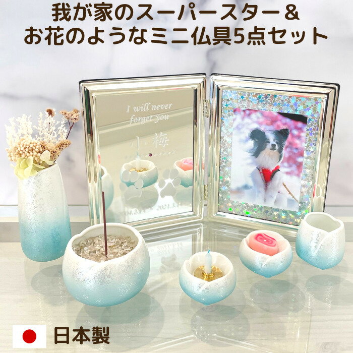 キラキラ輝くお位牌と淡いブルーの仏具5点セット■ペット 仏具 セット 仏壇 メモリアル ミニ仏具 肉球 ペット供養 お供え 手元供養 ガラス 陶器 犬 猫 うさぎ 手形 足形 メモリアルプレート グッズ インテリア 虹の橋 ペットロス オーナーグッズ 遺影 写真 かわいい おしゃれ