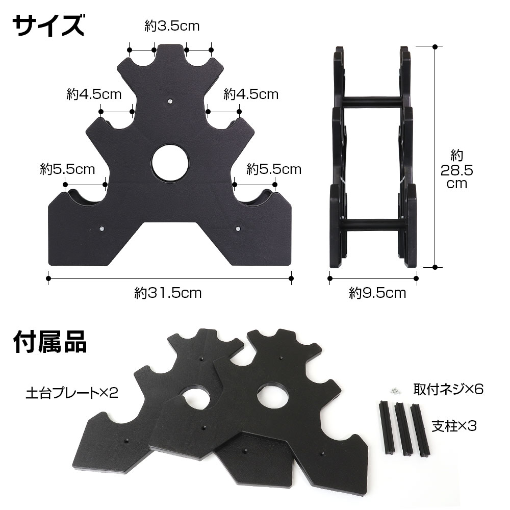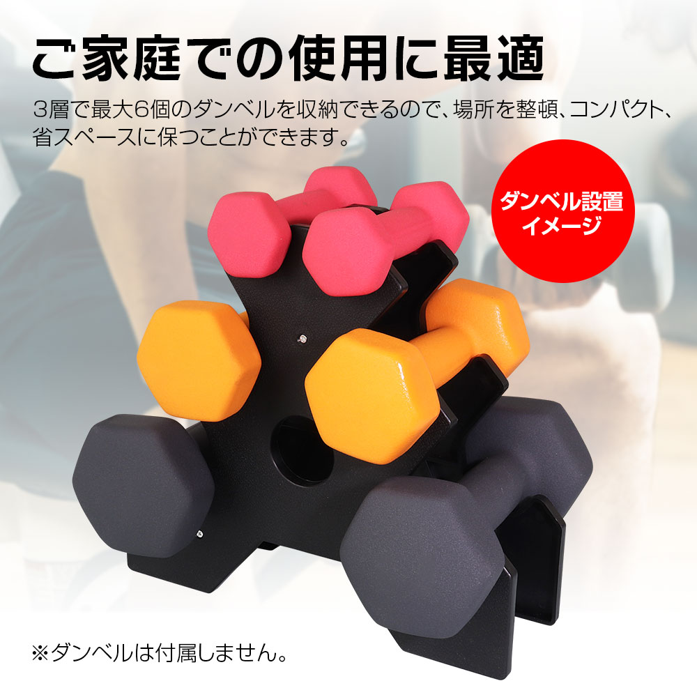 メーカー希望小売価格はメーカーサイトに基づいて掲載しています 商品の保証期間について(重要) 通常の保証期間は到着後から30日間となりますが、1年間保証など別途設定されている商品もあります。製品仕様に記載がありますのでご確認ください。また商品のサポートや保証方法について記載しております「ご注文前の注意事項、当社商品のサポートについて」をご注文前に必ずご確認いただきます様お願い申し上げます。ダンベルの収納に 最大6個のダンベルがスッキリと収納できるスタンドです。 ご家庭での使用に最適 3層で最大6個のダンベルを収納できるので、場所を整頓、コンパクト、省スペースに保つことができます。 材質:プラスチック 段数:3段 配置できるダンベルの数:6個 サイズ:約31.5×9.5×28.5cm 商品内容 土台プレート×2、支柱×3、取付ネジ×6 ご購入前のご注意 ※商品写真はあくまでイメージです。実際の商品と異なる場合がございますので、予めご了承ください。 ※輸入品につき、パッケージにダメージがある場合がございます。 ※ダンベルは別売です。 ※取扱説明書、ドライバーは付属しません。 「商品ページ」に保証期間が記載されている場合は商品ページの保証期間が適用されます。ご購入前に必ずご確認頂きます様お願い致します。 その他の商品保証に関しましては「返品、交換、保証について」を、ご注文前に必ずご確認下さい。 ご注文後の、保証内容錯誤による、ご対応は一切お受けできません。
