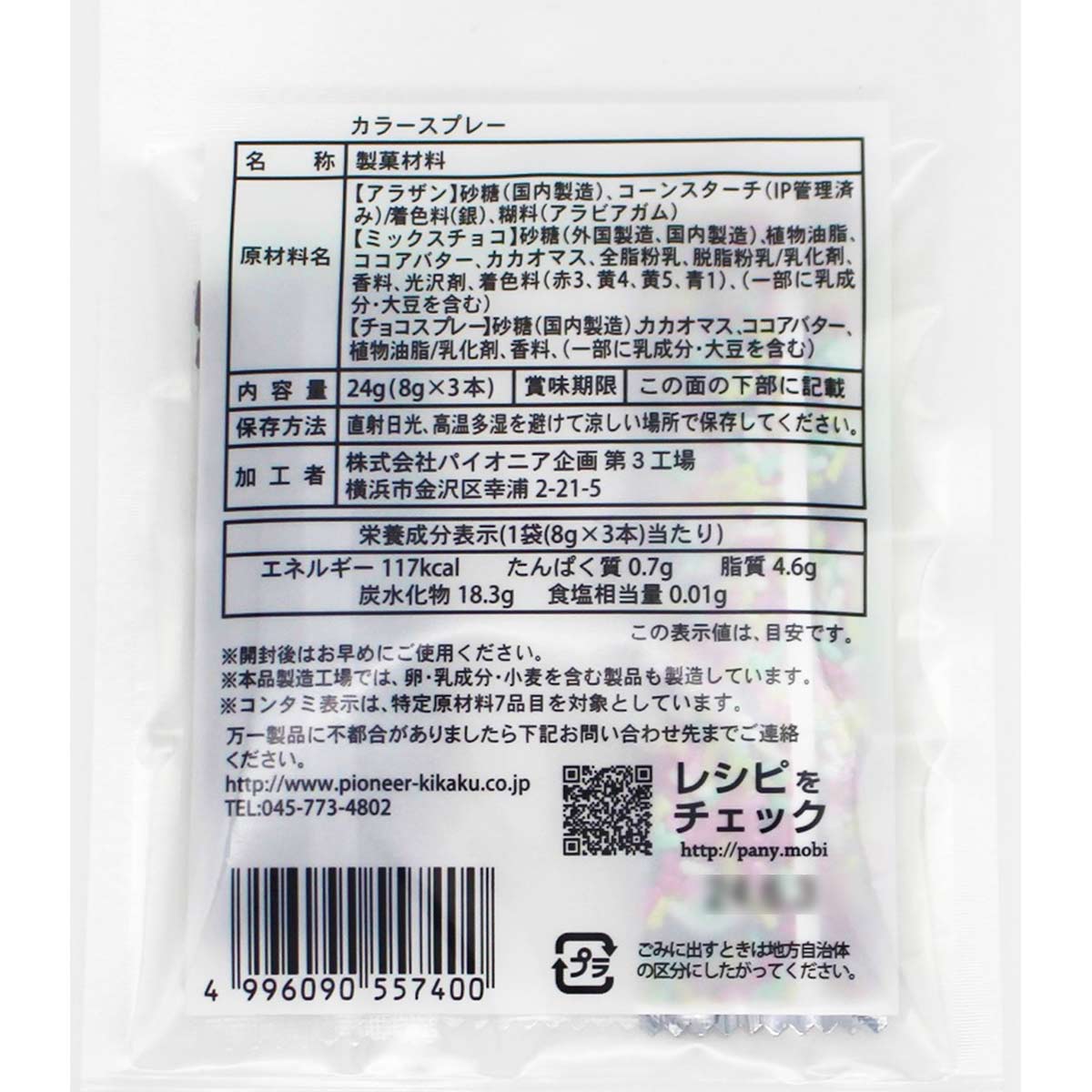 よく一緒に購入されている商品チョコペン 青 ロイヤル 速乾性チョコペン10140円トッピングシュガー/製菓材料/ スイーツ 239円チョコレートモールドクローバー 製菓道具330円アラザン、ミックスチョコ、チョコスプレーの3種類がセットになった便利な1品です。 ケーキ、クッキー、トリュフ等のデコレーションにお使いください。 ・名称:製菓材料 ・原材料:【アラザン】砂糖(国内製造)、コーンスターチ(IP管理済み)/ 着色料(銀)、粘料(アラビアガム)【ミックスチョコ】砂糖(外国製造、国内製造)、植物油脂、、ココアバター、カカオマス、全脂粉乳、脱脂粉乳/乳化剤、香料、光沢剤、着色料(赤3、黄4、黄5、青1)、(一部に乳成分・大豆を含む)【チョコスプレー】砂糖(国内製造)、カカオマス、ココアバター、植物油脂/乳化剤、香料(一部に乳成分・大豆を含む) ・内容量:24g(8g×3本) ・賞味期限:別途商品ラベルに記載 ・保存方法:直射日光・高温多湿を避けて保存してください。 ・製造者:株式会社パイオニア企画 横浜市金沢区幸浦2-21-5 ・メーカー希望小売価格はメーカーカタログに基づいて掲載しています メーカーカタログ類似商品はこちらカラースプレー チョコ ミックスチョコ 50g346円カラースプレー チョコ 業務用 ミックスチョコ3,001円カラースプレー チョコ 業務用 ミックスチョコ875円天然着色料のチョコスプレー 五色チョコスプレー367円チョコスプレー 50g 製菓用チョコレート ト367円業務用 チョコスプレー 250g 製菓用チョコ842円★500円クーポン有★ 'カラースプレー チョ2,376円チョコミントスプレー 500g 製菓用 チョコ2,376円チョコミントスプレー 250g 製菓用 チョコ1,188円新着商品はこちら2025/11/22★訳ありお値下げ★ ピンクのシュガーパウダーノ4,236円2025/11/13ラッピング ワックスペーパー バッグ 5枚入り734円2025/11/13ラッピング ワックスペーパー バッグ 5枚入り734円再販商品はこちら2025/11/22ピンクのシュガーパウダー30g 泣かない粉糖 259円2025/11/22サフ社インスタント・ドライイースト 金ラベル1774円~2025/11/22生ピスタチオ ダイス 100g ピスタチオ 1,426円2025/11/22 更新