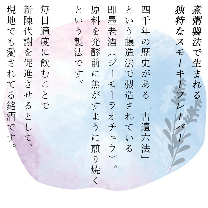 商品情報名称即墨老酒 焦香型(ジーモーラオジョウ)10年本数6本原材料名黍米、麦麹度数11.5度内容量500ml保存方法直射日光を避け常温保存してください。開封後は、7日以内で飲みきることをお勧めします。原産国名中華人民共和国輸入者株式会社太郎107-0052東京都港区赤坂3-11-14 ベルゴ602運営統括責任者名:田中力哉ケース販売 即墨老酒(ジーモー)10年焦香型 500ml 11.5度 紹興酒 老酒 黄酒 中華 | 中国酒 お酒 酒 ギフト 誕生日 プレゼント 内祝い 退職 記念品 お歳暮 中華酒 醸造酒 中国 高級 お祝い お礼 御歳暮 贈り物 贈答品 還暦祝い 退職祝い 長寿祝い 中華料理 祝い酒 晩酌 紹興酒 誕生日 プレゼント おしゃれ 中国酒 お酒 酒 無料 4000年の歴史がある「古遺六法」という醸造法で製造されている即墨老酒。最も特徴的なのが、原料を発酵前に焦がすように煎り焼くという製法です。焦香型は、主原料である黍米を煎り焼き、それによって生まれるスモーキーフレーバーが特徴です。大量のビタミンの他、無機塩、微量元素などが含まれており毎日適度に飲むことで新陳代謝を促進させるとして、現地でも愛されている酒です。さらにこの酒で河蟹を煮て食べると、腰痛、足痛が治り、婦人病にも効くと証明されているようで、女性が飲むと、生理不順、生理痛、産後の腹痛に効き、産後の肥立ちが悪い人は、この酒で鶏の卵を煮て食べると良くなるとして、料理でも活用されています。 2