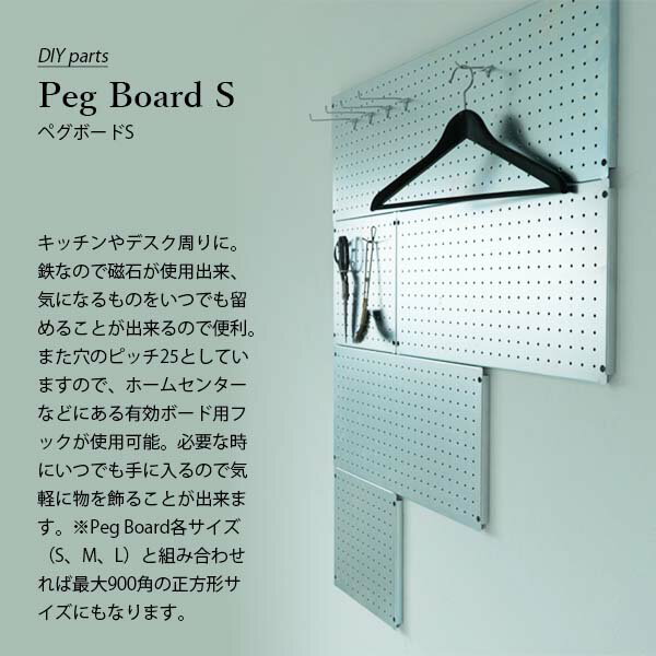 キッチンやデスク周りに。鉄なので磁石が使用出来、気になるものをいつでも留めることが出来るので便利。また穴のピッチ25としていますので、ホームセンターなどにある有効ボード用フックが使用可能。必要な時にいつでも手に入るので気軽に物を飾ることが出来ます。※Peg Board各サイズ(S、M、L)と組み合わせれば最大900角の正方形サイズにもなります。DIY parts Peg Board S ペグボードS 鉄の素材感が味わい深く汎用性の高い有孔ボード キッチンやデスク周りに。鉄なので磁石が使用出来、気になるものをいつでも留めることが出来るので便利。また穴のピッチ25としていますので、ホームセンターなどにある有効ボード用フックが使用可能。必要な時にいつでも手に入るので気軽に物を飾ることが出来ます。※Peg Board各サイズ(S、M、L)と組み合わせれば最大900角の正方形サイズにもなります。 - Features - Function 01有孔ボードホームセンターなどにある有孔ボード用フックが使用可能。手軽に収納環境が作れます。 Function 02 磁石 鉄素材なので磁石もご利用いただけます。マグネットクリップなどでペーパーを挟んだりと幅が広がります。 Function 03 素材感 鉄の素地を活かした仕上げにしており、鉄本来の素材感が味わえ、経年とともに味わい深い酸化や錆が出る場合があります。 Function 04 組み合わせ シリーズでS、M、Lの3サイズをご用意。組み合わせ方で多様な収納、ディスプレイが可能です。 Function 05 サイズ 使用シーンをイメージし用途に応じてストレスなく快適にお使いいただけるサイズ感を追求しています。 - Color/Variation - SIKAKU Peg Board S 70301 SV - シルバー 組み合わせて使える、サイズ違いもございます。シリーズ一覧はこちら! - Specifications - ■サイズ (約) W300×D18×H300 mm ※ピッチ25mm ■素材 鉄(メッキシルバー) ■製品仕様のご注意事項 ・鉄を使用した商品は、素材がもつ本来の風合いを活かして1点ずつ手作業で仕上げています。溶接跡や傷、多少のサビや塗装の剥がれ等は不良とはみなしていません。手作りのため多少のサイズ誤差がある場合があります。・鉄商品は使用していくうちに酸化が進行し、サビが発生する場合があります。経年変化や劣化も素材の持つ特徴、表情の一つです。ご理解のうえお買い求めください。・一点づつ手作りのため多少のサイズ誤差がある場合があります。・屋外に放置し続けたり、高温多湿の場所には設置しないでください。鉄の酸化を早め、サビの原因になります。雨に濡れた場合はすぐに拭いてください。 ■ご購入に関するご注意事項 ・受注生産の為、納期はその時々の受注状況によって多少前後いたします。・ご注文後のキャンセルはできません。また、ご決済確定後(前金)の生産の為、代金引換のご決済はご利用いただけません。(システムの仕様上選択できてしまいますが、キャンセルとさせていただきます。) ■取付時のご注意事項 壁面に取り付ける際は下地が入っていることをご確認ください。入っていない所へ取り付ける際はアンカービスを使用してご利用ください。 ■原産国 日本(岐阜県) ※製品の価格、仕様等は予告なく変更する場合がございます。 予めご了承ください。 - Brand information - 死角を愉しむふだんの目の届かないところ。身近過ぎて見えないところ。そんな暮らしの中の死角を、なに気に愉しむ暮らしの提案 SIKAKUは岐阜県大垣市にある小さな鉄工所から始まったインテリアショップです。創業50年を超える鉄工所で培ってきた経験・技術を応用して自分たちが毎日の生活の中で本当に使いたいものを製作しており、オリジナルの家具・看板・パーツは自社で一点一点手作業で仕上げております。またオリジナル商品の他にも素材やデザインにこだわって作られたインテリア雑貨もセレクトして取り扱っています。その他「SIKAKU」の製品はこちら