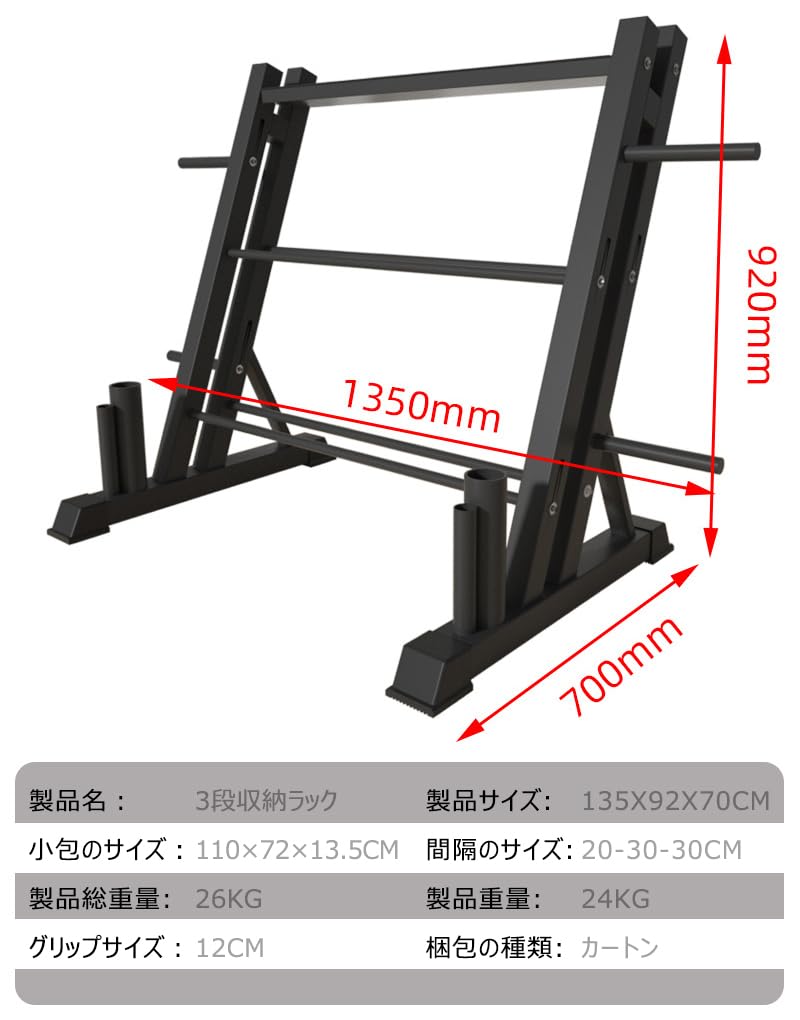 【仕様-ダンベルラック】製品サイズ:1350x700x920mm。 製品重量:24KG(正味重量) 適用範囲:家庭用/商業用 製品材質:スチール 製品スタイル:多機能 【さまざまな保管と厚い鋼板のサポート】さまざまな保管方法でさまざまな製品のニーズを満たすことができ、強力な耐荷重能力、耐久性、持ち運びが簡単です。 【丈夫で耐久性のある - ダンベルウェイトラック】ダンベルラックスポーツストレージは高品質の金属と木板素材で作られており、慎重に加工され、強く、耐摩耗性があり、耐久性があるように設計されています。 カウンターウェイトラックは約300kgの重量に耐えることができ、スポーツ用品の保管に非常に適しています。 【ホームジム収納ラック - ダンベルラック】この多機能ダンベルラックには3層ダンベルラックが含まれており、最初の層はケトルベル、ウォーターボトル、携帯電話、その他の個人的なアイテムを収納できる収納スロットです。 さまざまなフィットネス機器を1つの収納ラックに整理してスペースを整理できます。 とても適しています。 【組み立て簡単 - ホームジムダンベルラック】明確な組み立て説明書と取り付けツールが付属しており、説明書の手順に従って簡単に組み立てることができます。 ヒント: カウンタウェイト フレームが完全に組み立てられるまでボルトを締めないでください。 組み立ての最後のステップは、すべてのネジを締めてダンベル ラックのバランスを確保することです。【多機能ダンベルラック】自分の個人スペースに便利なジムを作成するには、適切な設備が必要です。 このダンベルラックは、ダンベルを簡単に整理できます。 この非常に実用的なダンベル オーガナイザーでジム スペースをコントロールしましょう。多層ストレージ各種収納強力な耐荷重性場所をとりません【混乱に別れを告げて、一度に解決しましょう】用途に関係なく、ダンベル収納ラックを使用すると機器を簡単に整理できるので、ウェイトリフティングや掃除に集中できます。 スチール製。 汗や湿気を効果的にはじき、時間の経過による錆の蓄積を防ぐ頑丈な構造を特徴とするこのジムオーガナイザーは、信頼性が高く長持ちします。この多機能ストレージ デバイスは、人間工学に基づいて設計された構造を備えており、機器へのアクセスが容易になります。 さまざまなサイズのスチールおよび鋳鉄のダンベルに適合します。 コンパクトで薄型のデザインにより、フィットネス エリアのどの場所にもラックを簡単に配置できます。【スタンピング収納溝】製品をより強くする【厚鋼板サポート】強力な耐荷重性、耐久性があり、持ち運びが簡単です【各種収納】さまざまな製品の保管に対応するさまざまな保管方法品質サービス:1、 当社の製品に問題がある場合は、お気軽にお問い合わせください。2、輸送中に多少の衝撃が加わる可能性がございます。万が一不具合や破損などがございましたら、部品の再送など対応させていただきますので、お気軽にご連絡くださいませ。3、商品が多いため、発送時に説明書をお送りし忘れることがございます。万が一、説明書が届いていない場合や、商品組み立てに関してご不明点がございましたら、お手数ですがご連絡いただけますようお願い申し上げます。電子版の説明書を再送させていただきますので、どうぞご安心ください。お客様にはご理解いただきますようお願い申し上げます。お客様のご支援が、私たちの励みとなっております。