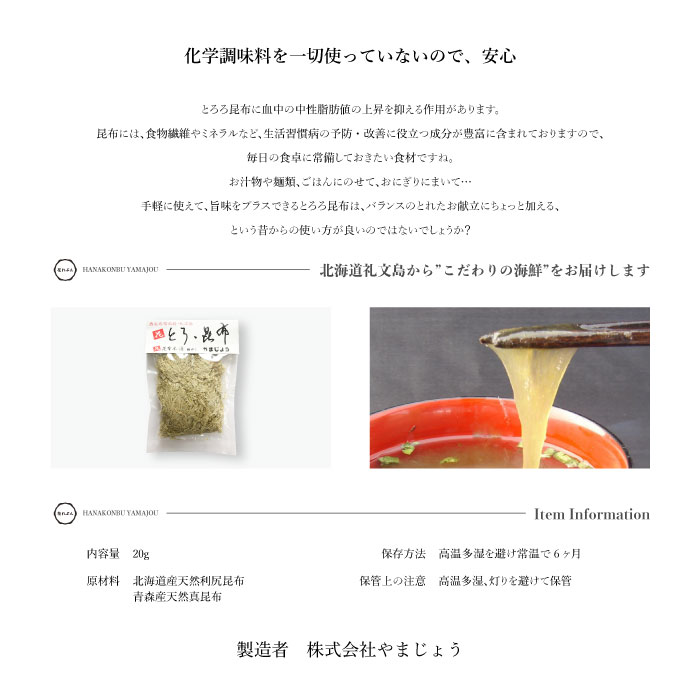 商品詳細名称とろろ昆布 原材料名 北海道産天然利尻昆布・青森産天然真昆布 内容20g 賞味期限 常温6ヶ月 保存方法高温多湿、灯りを避けて保管 販売者 株式会社やまじょう北海道礼文郡礼文町香深村字トンナイ558-16 花れぶん内TEL:0163861176 化学調味料を一切使っていないので、利尻昆布のうま味をそのままお楽しみ頂けます。 ふんわり細かく削ってありますので、おにぎりにまぶすとしっとりやさしい自然の塩味が美味です。 また、お吸い物やおうどん、おそばなどに浮かべて、とろとろと滑らかな口当たりをお楽しみ下さい♪Item Information 内容量 20g 原材料 北海道産天然利尻昆布・青森産天然真昆布 保存方法 高温多湿を避けて常温で6ヶ月 保管上の注意 高温多湿、灯りを避けて保管 販売者 株式会社やまじょうKA