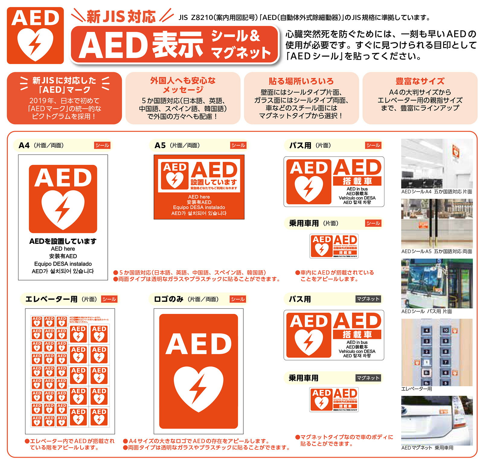■「日本AED財団」監修 JIS規格準拠 AED設置シール AEDマーク ステッカー■ サイズ:W100mm×H50mm■ 片面印刷■【AED搭載車】と一目でわかる片面印刷ステッカーです。■ 乗用車やタクシーに最適なサイズです。 AED(自動体外式除細動器)の設置場所を表示する新しい案内用図記号(JIS規格)が制定されました。 わが国ではAEDを表す統一的なピクトグラムが存在しておらず、様々なデザインマークが入り乱れて使用されてきました。 AEDは、緊急的な対応が必要となるものであり、人命救助の観点からも、緊急時にすぐに理解できる統一的なピクトグラムの必要性が高まっています。 この度JIS制定されたAEDの統一的ピクトグラムの普及により、AEDの設置状況がよりわかりやすくなり、緊急時の対応に役立つことが期待されます。 急な心停止で亡くなってしまう人(心臓突然死)の数は、1年間でなんと約7万人。 1日約200人、7.5分に1人が心臓突然死で亡くなっています。 しかし、心停止してから胸骨圧迫とAEDを適切に使用すれば約6倍の命が救えると言われています。 そこで、一刻も早くAEDを使用できるよう、すぐに見つけられる目印としてAEDシールがあります。