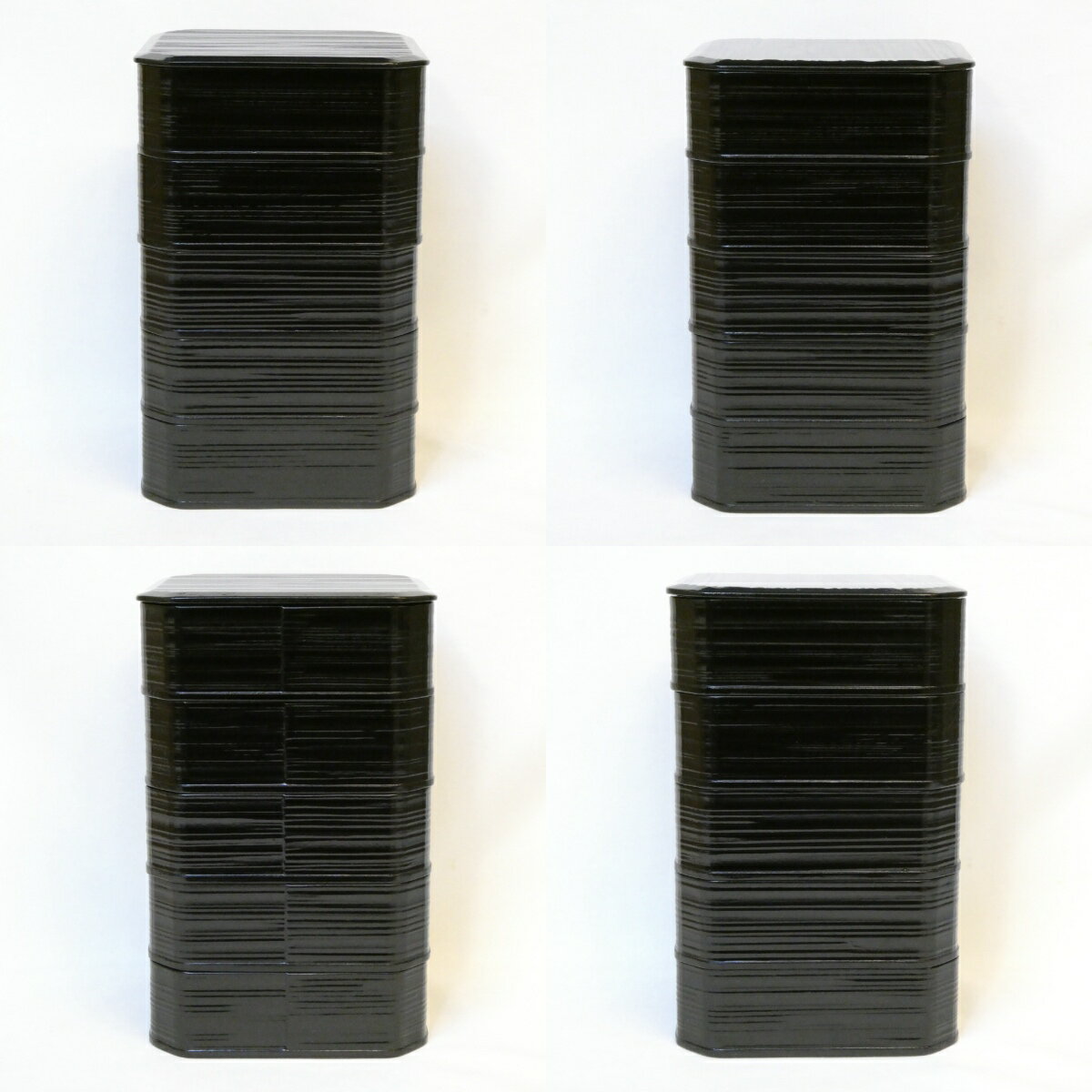 【十月の特売品】 本堅地漆器 平安漆匠 鈴木表朔作 五重縁高 黒ヘギ目 一閑塗 片木目 懐石道具 木製 茶道具【中古 美品】