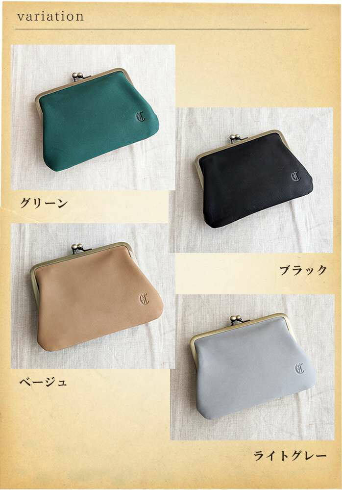 ふっくら、さらりとした質感が気持ちいいソフトスムースレザー仕立てのポーチ。パチンと心地よい音を鳴らす、がま口デザインです。ガバっと開いてすっきりと収納可能な、じゃばら仕切り。4層のスペースのうちサイド2つは深め、中央2つは浅めに設計されているので、用途によって便利に使い分けが可能です。小物入れとしてはもちろんミニ財布としても活躍。マルチに使えるがま口ポーチは、ギフトとしてもオススメです。 83-2880(BEIGE) 83-2881(GREEN) 83-2882(LIGHT GRAY) 83-2883(BLACK) ◎関連キーワード:バッグ ポーチ がま口 ベージュ グリーン グレー ブラック 日本製 商品番号:cn-cl3596《 CLEDRAN −クレドラン− 》 未知の扉を開けたとき、新たな時が刻まれる・・・ そんな扉を開ける鍵(CLE)を提案します。 文字盤(CADRAN)に時を刻むように、商品に「愛着」と言う名の時を刻んでもらうたいという思いを込めたブランドです。